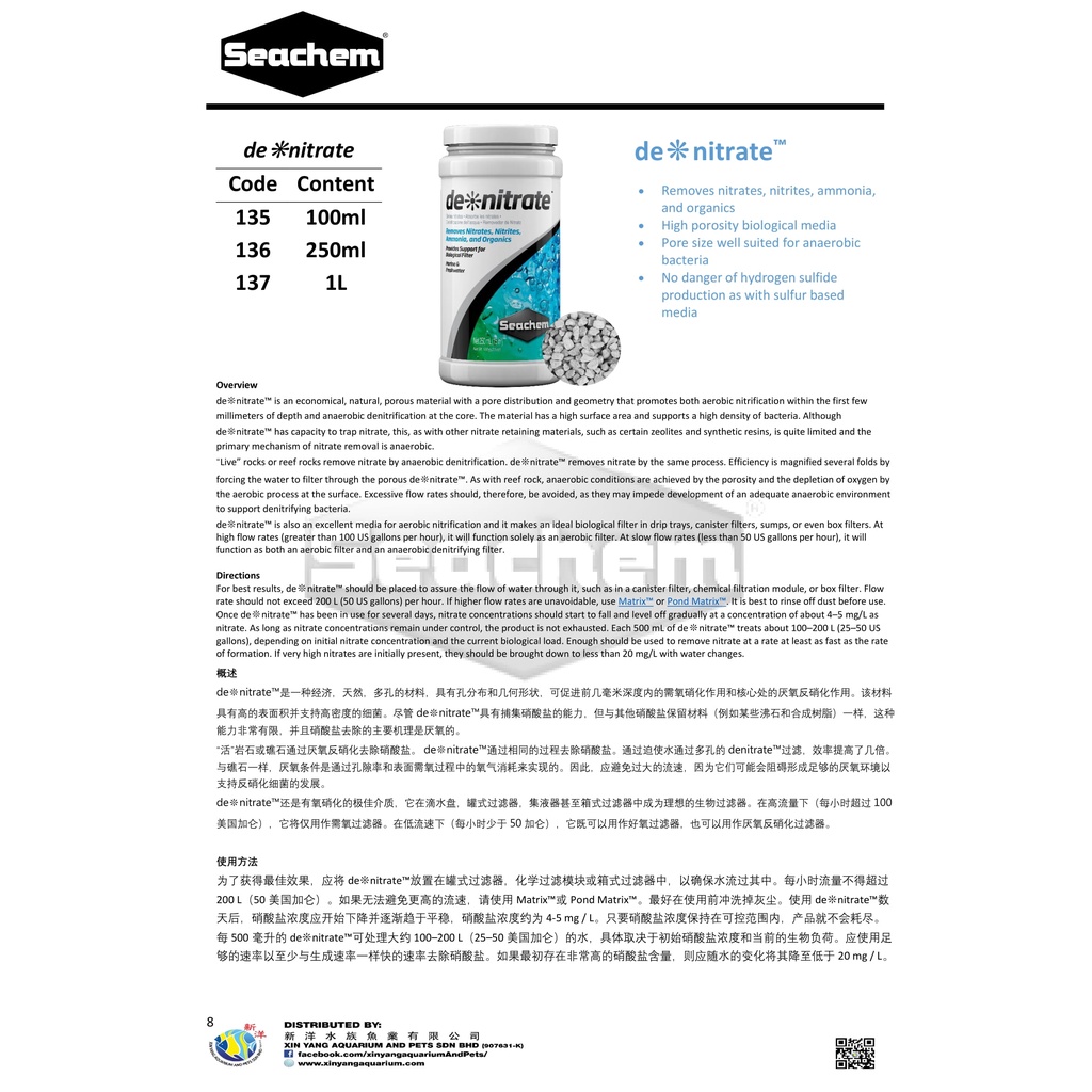 SEACHEM DE*NITRATE - 100ML (BAGGED) / 250ML / 1L