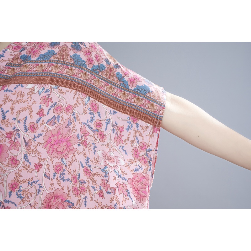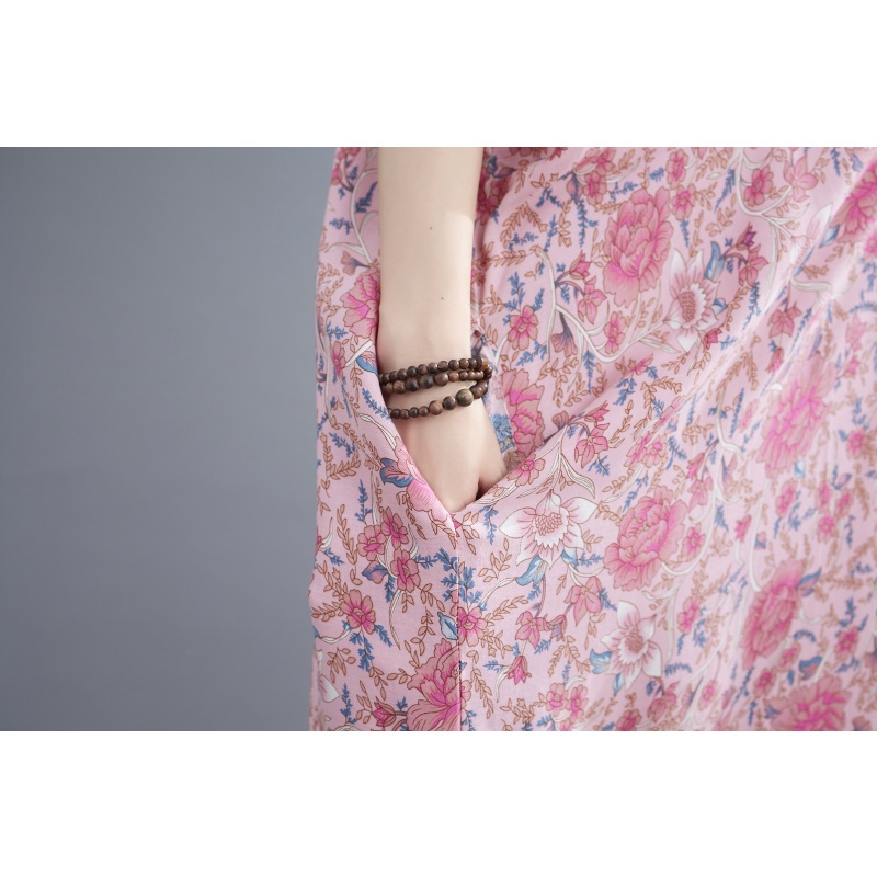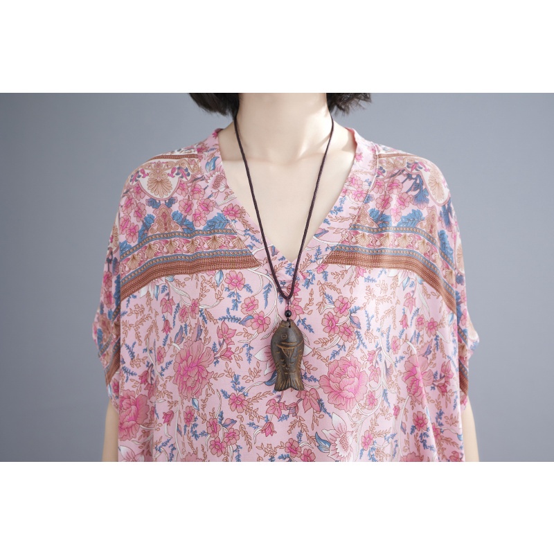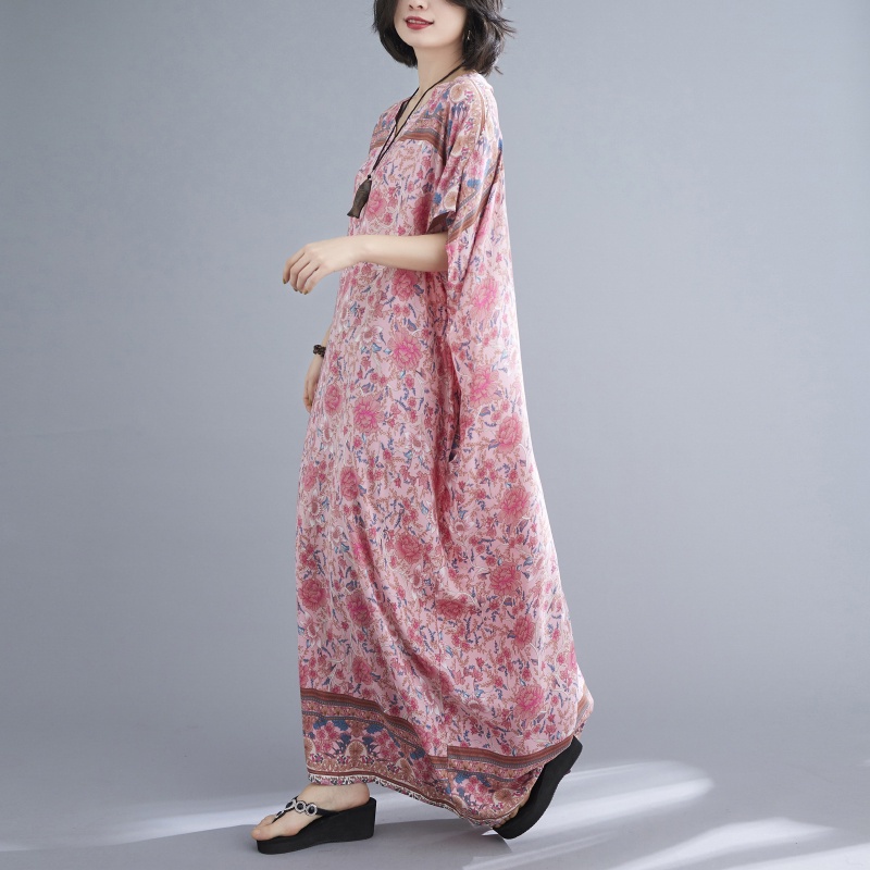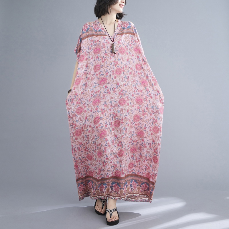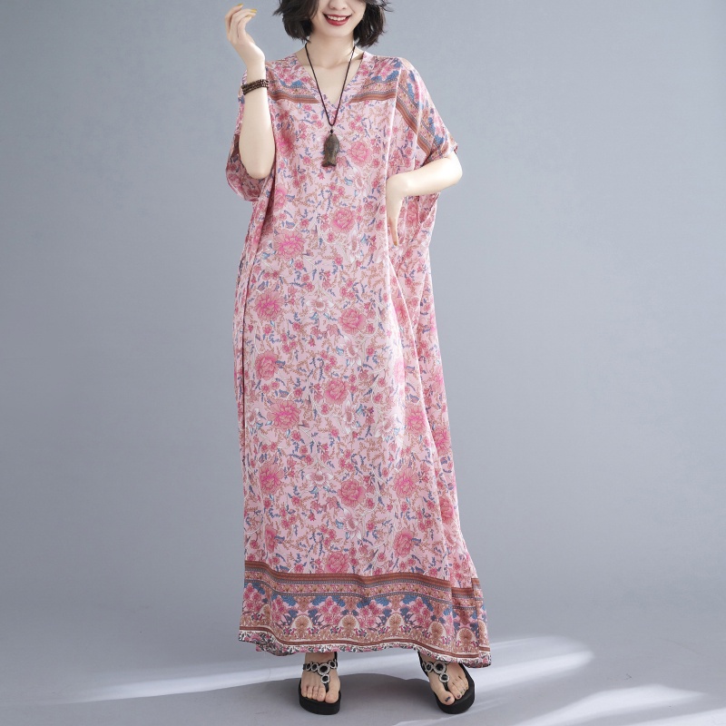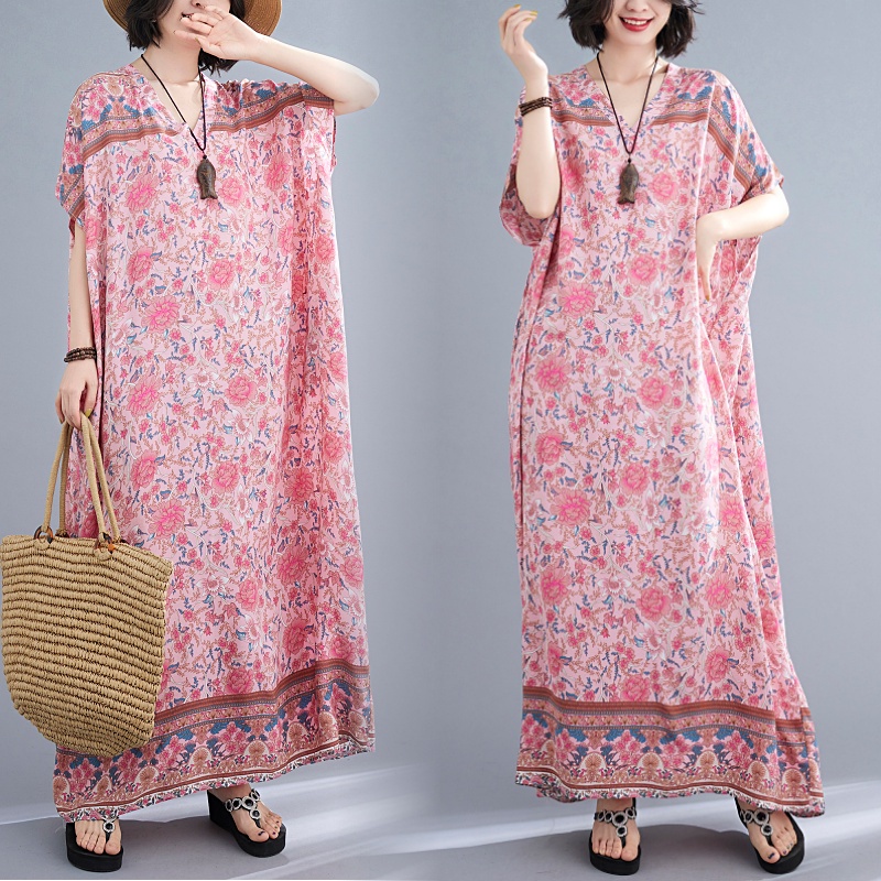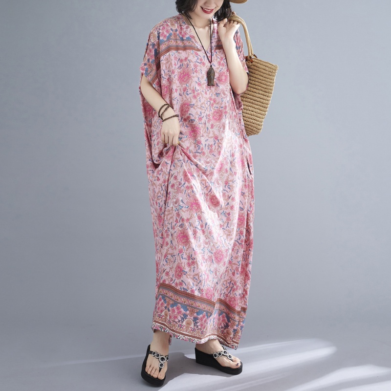 Women's Fashion Baju Kelawar Premium Baju Kaftan Viral Pink Floral Bohemian V-neck Cotton Plus Size Short Sleeve Summer Loose Gown