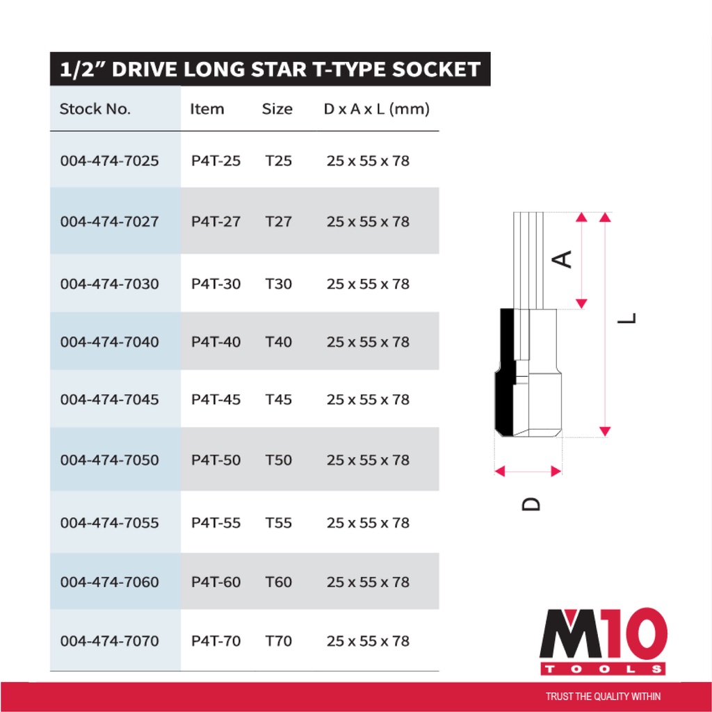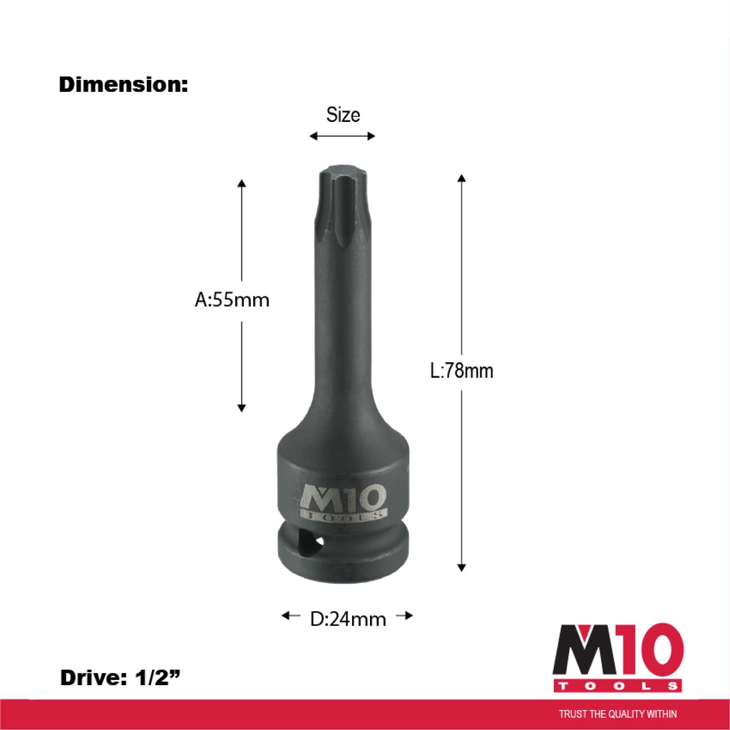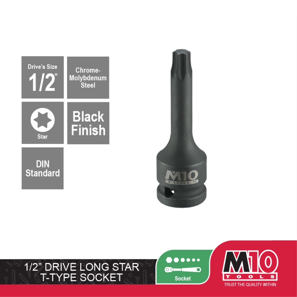 M10 1/2" Drive Long Star T-Type Socket ( 25mm x 55mm x 78mm ) - T25 / T27 / T30 / T40 / T45 / T50 / T55 / T60 / T70