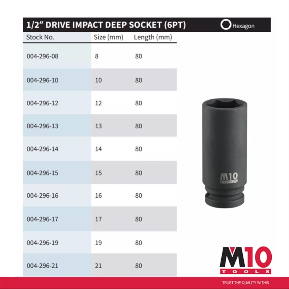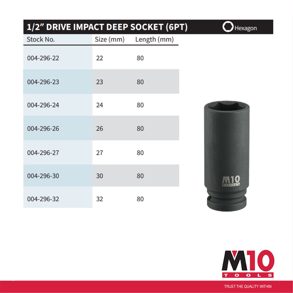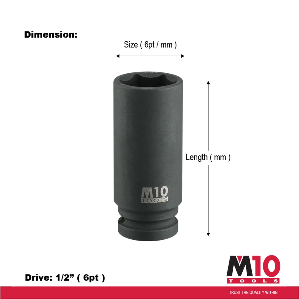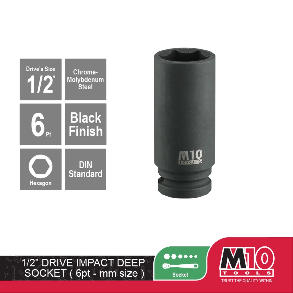 M10 1/2" Drive Impact Deep Socket (6PT) - 8 / 10 / 12 / 13 / 14 / 15 / 16 / 17 / 19 / 21 / 22 / 23 / 24 / 27 - 32 mm