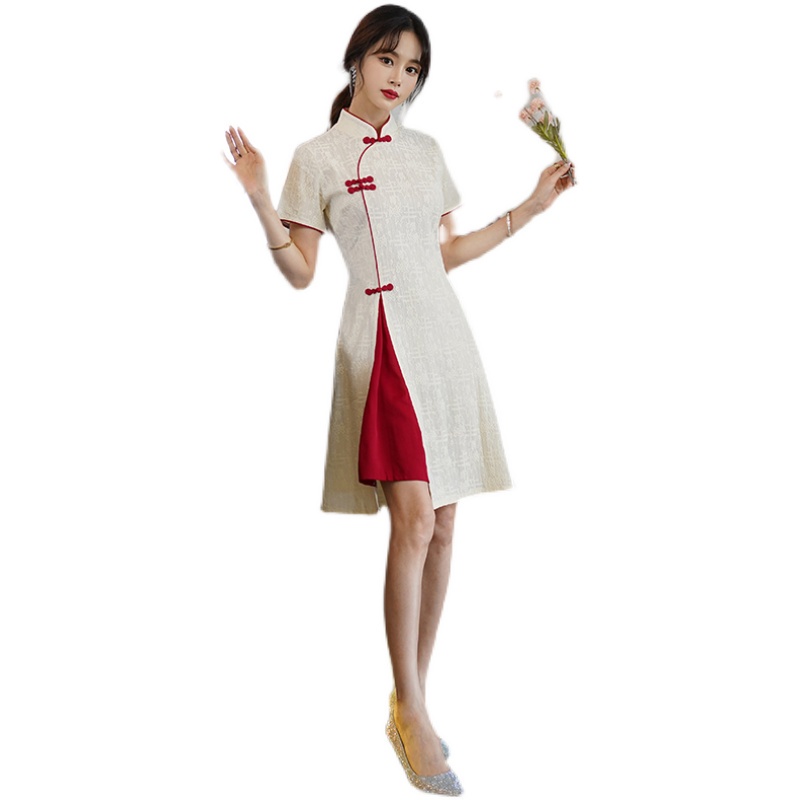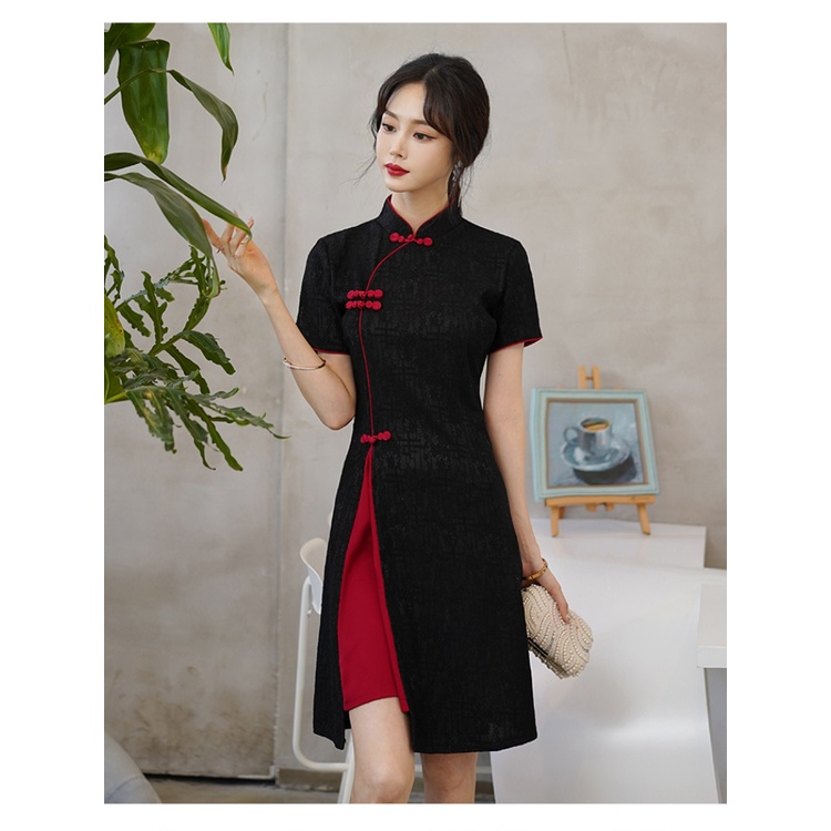 Vintage Chinese Traditional Wear Party Women Qipao Dress Summer Stand Collar Short Sleeve Red Black Modern Cheongsam New Year Clothes CNY 新年大码中式旗袍改良版連衣裙