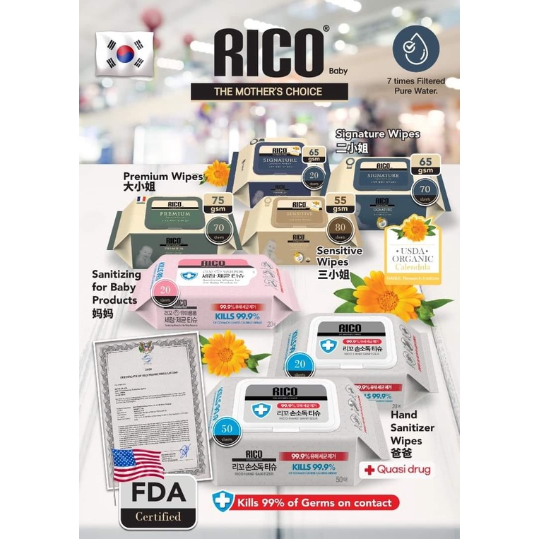 RICO Korea tisu basah(Premium | Signature | Sensitive | Baby Surface Wipes | Hand Sanitizer Wipes)