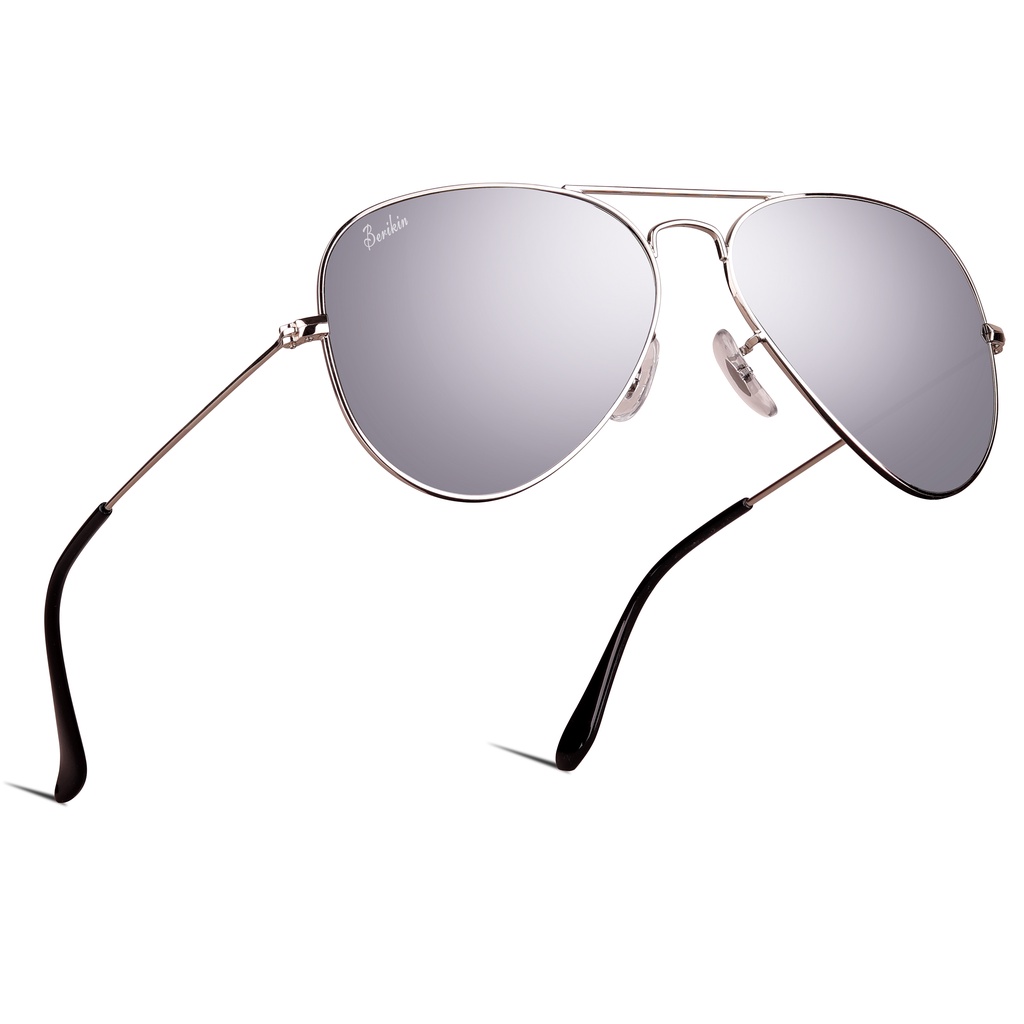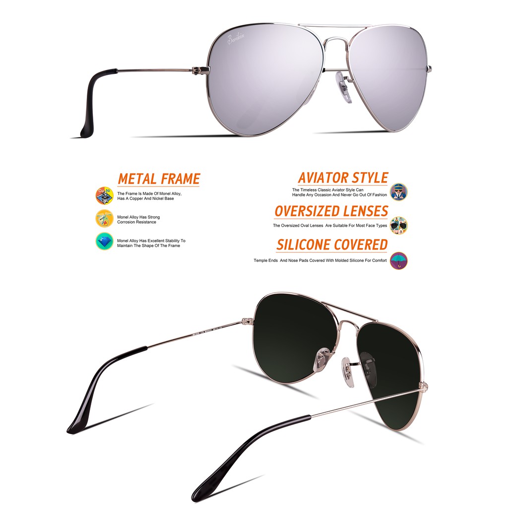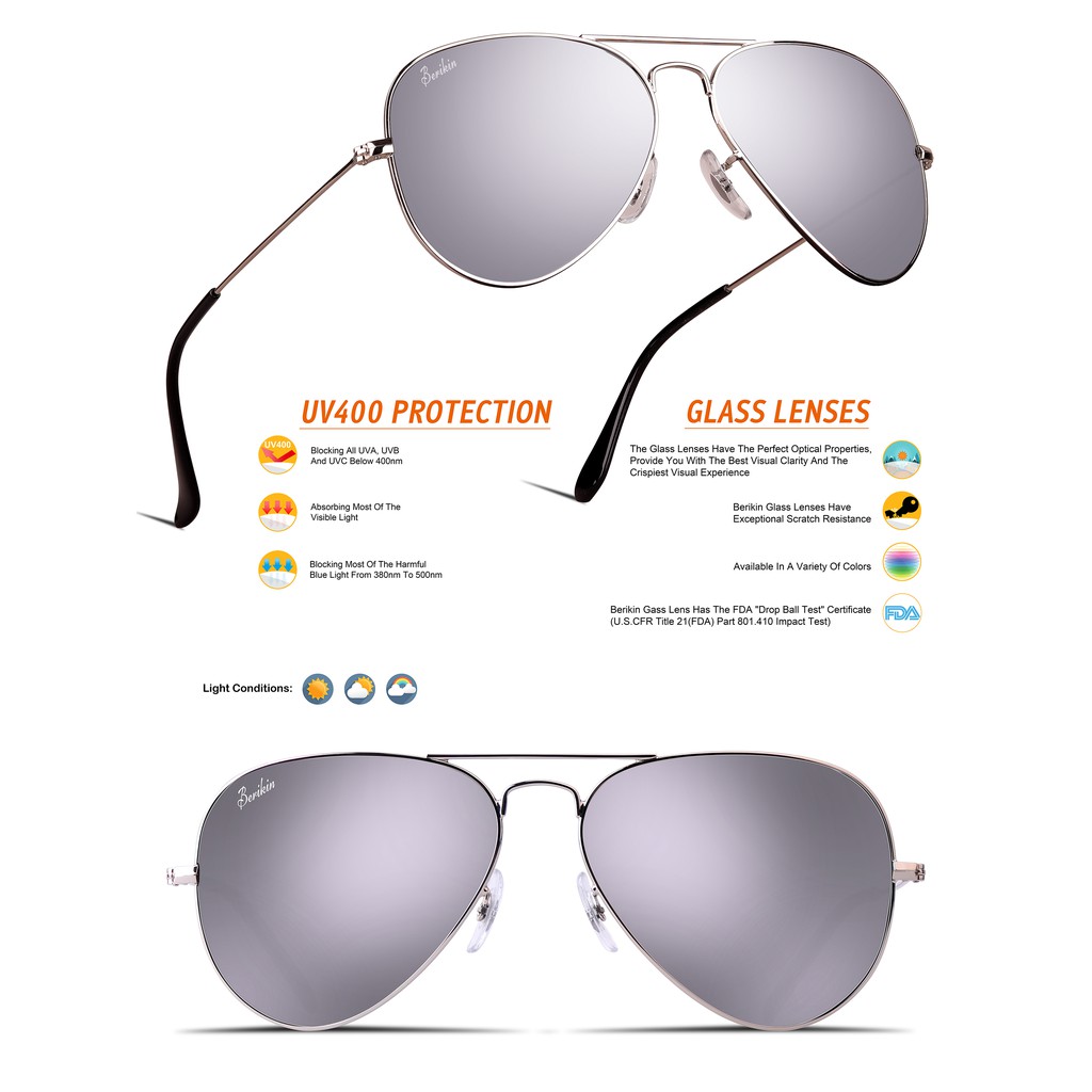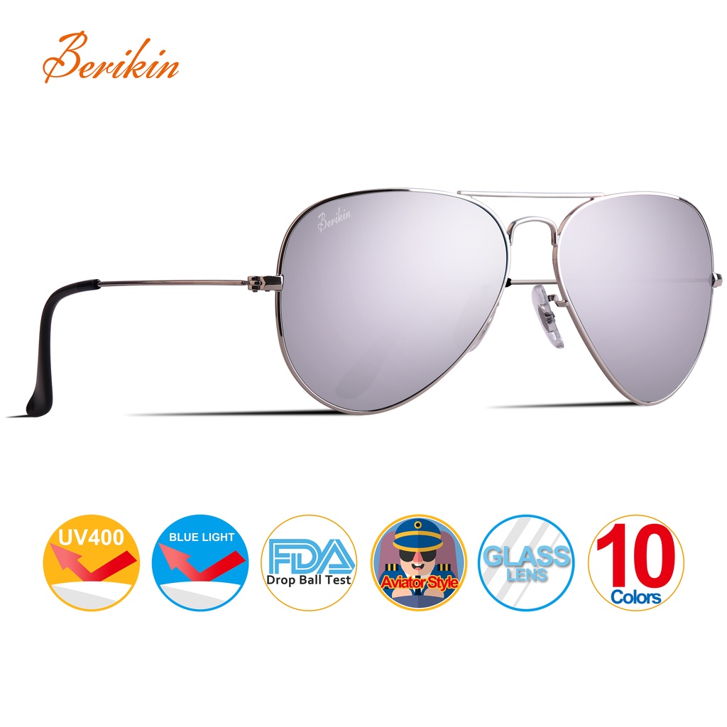 Berikin Classic Aviator Style Mirror Coating Sunglasses For Men Women 100% UV400 Protection Sliver Flash Glass Lenses Sliver Metal Frame 58mm