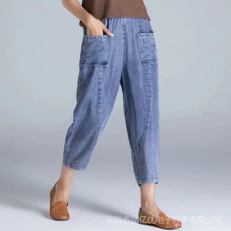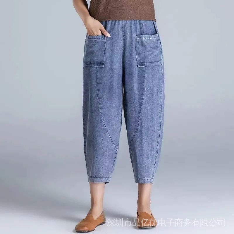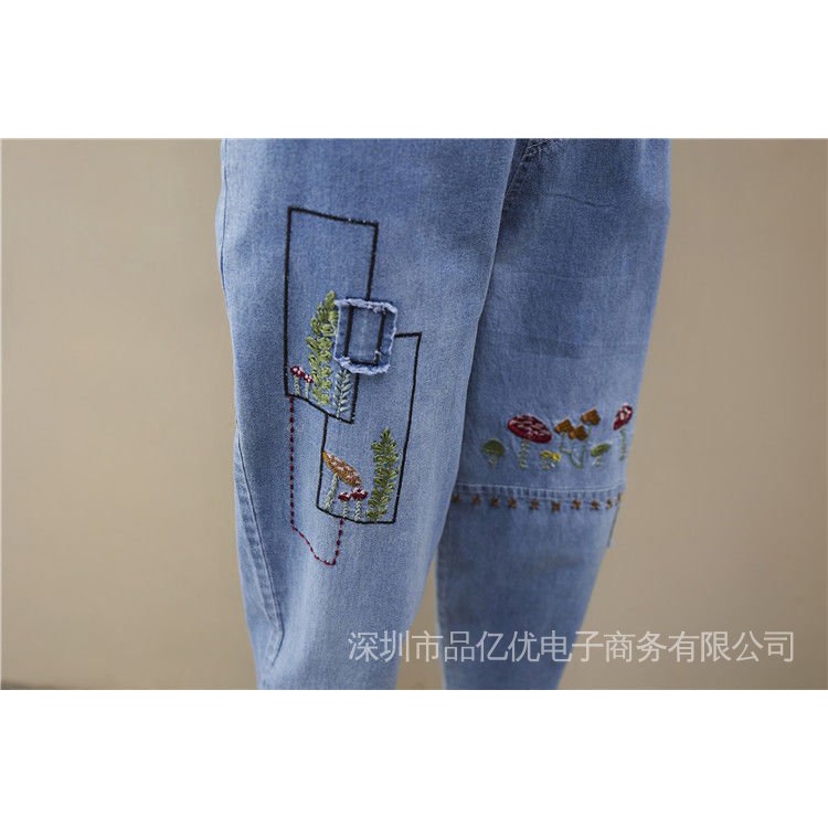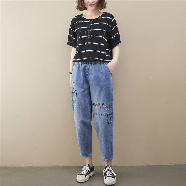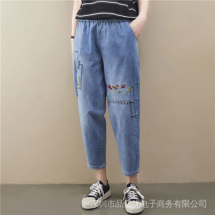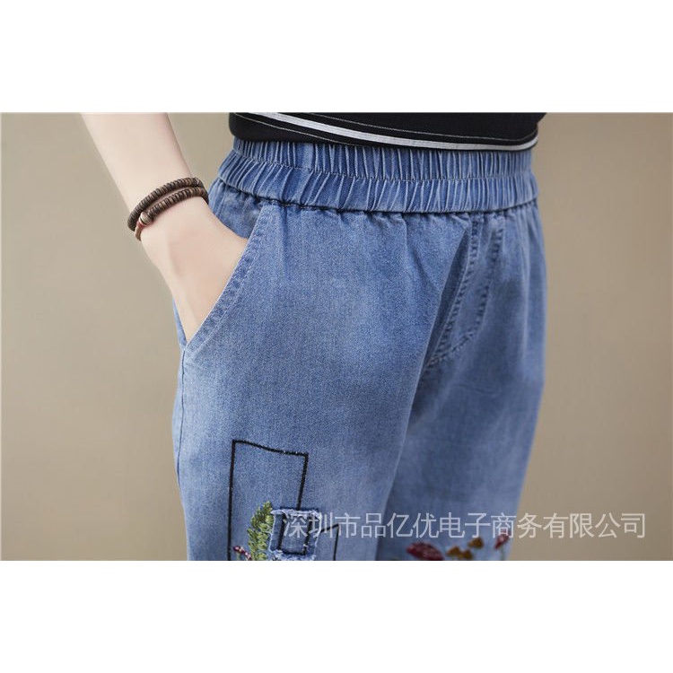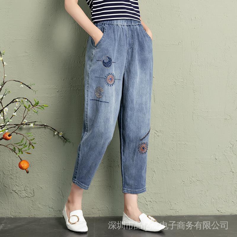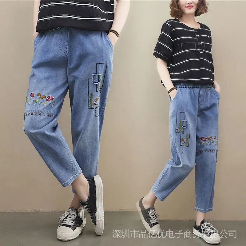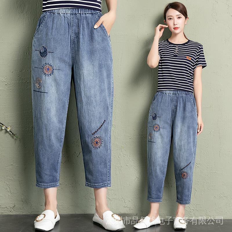J472👍👍Summer New Style Plus Size Women's Jeans Loose High Waist Slimmer Look Embroidered Casual Harem Pants