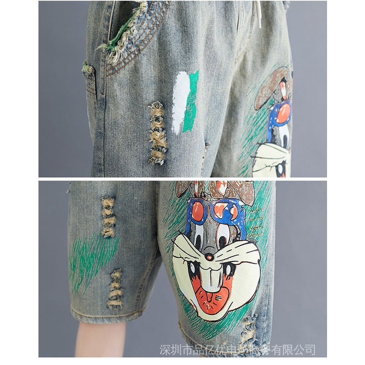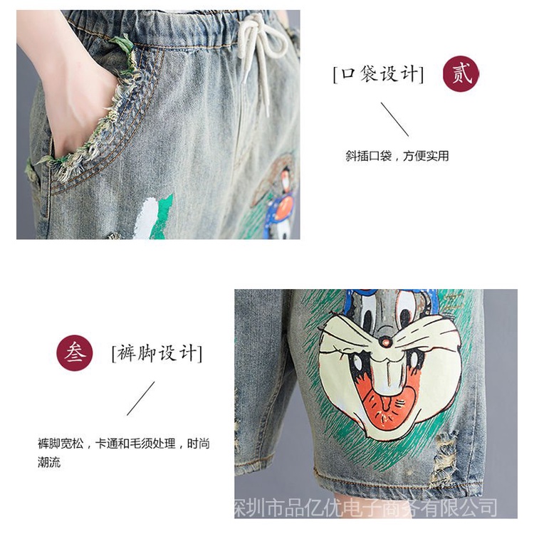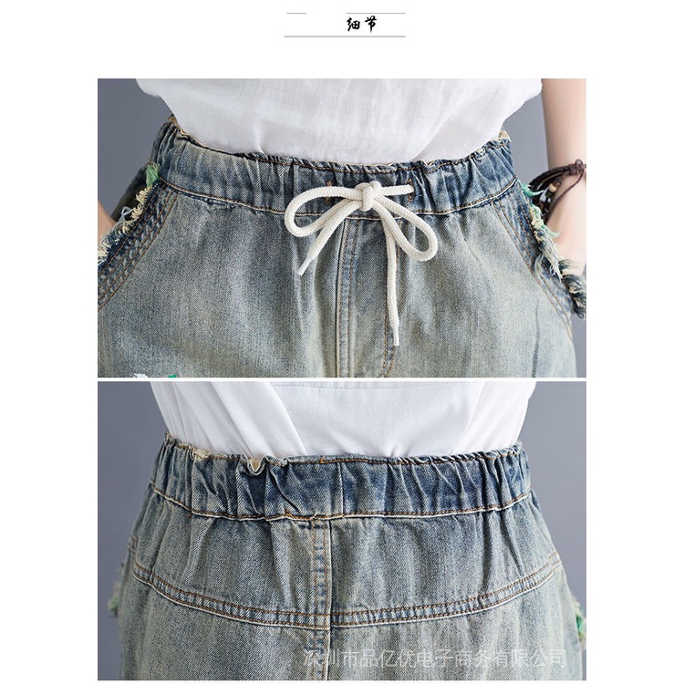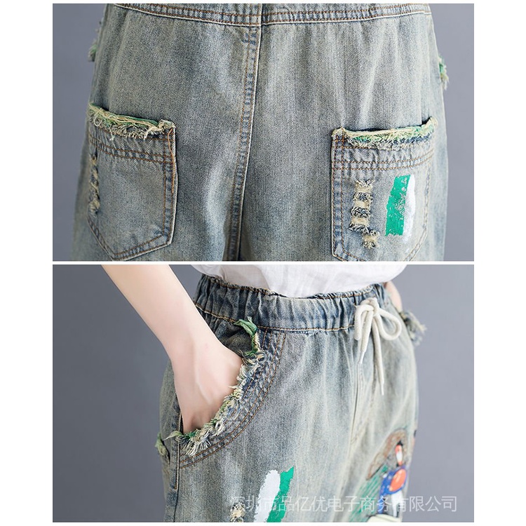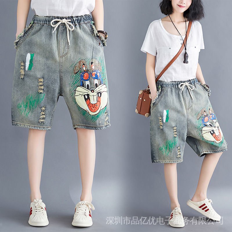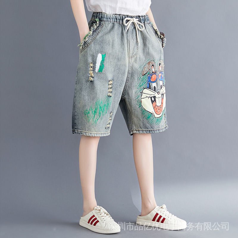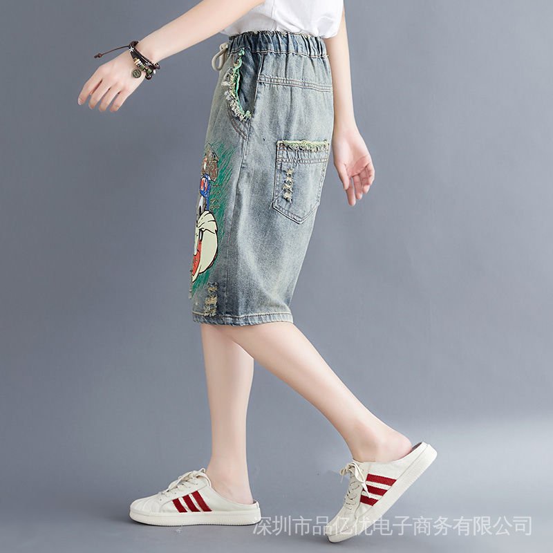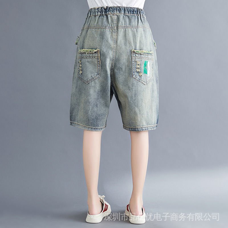 J932✨✨Embroidered Five-Point Jeans Women Summer Loose Ripped Elastic Waist Denim Shorts Thin Style Casual Large Size