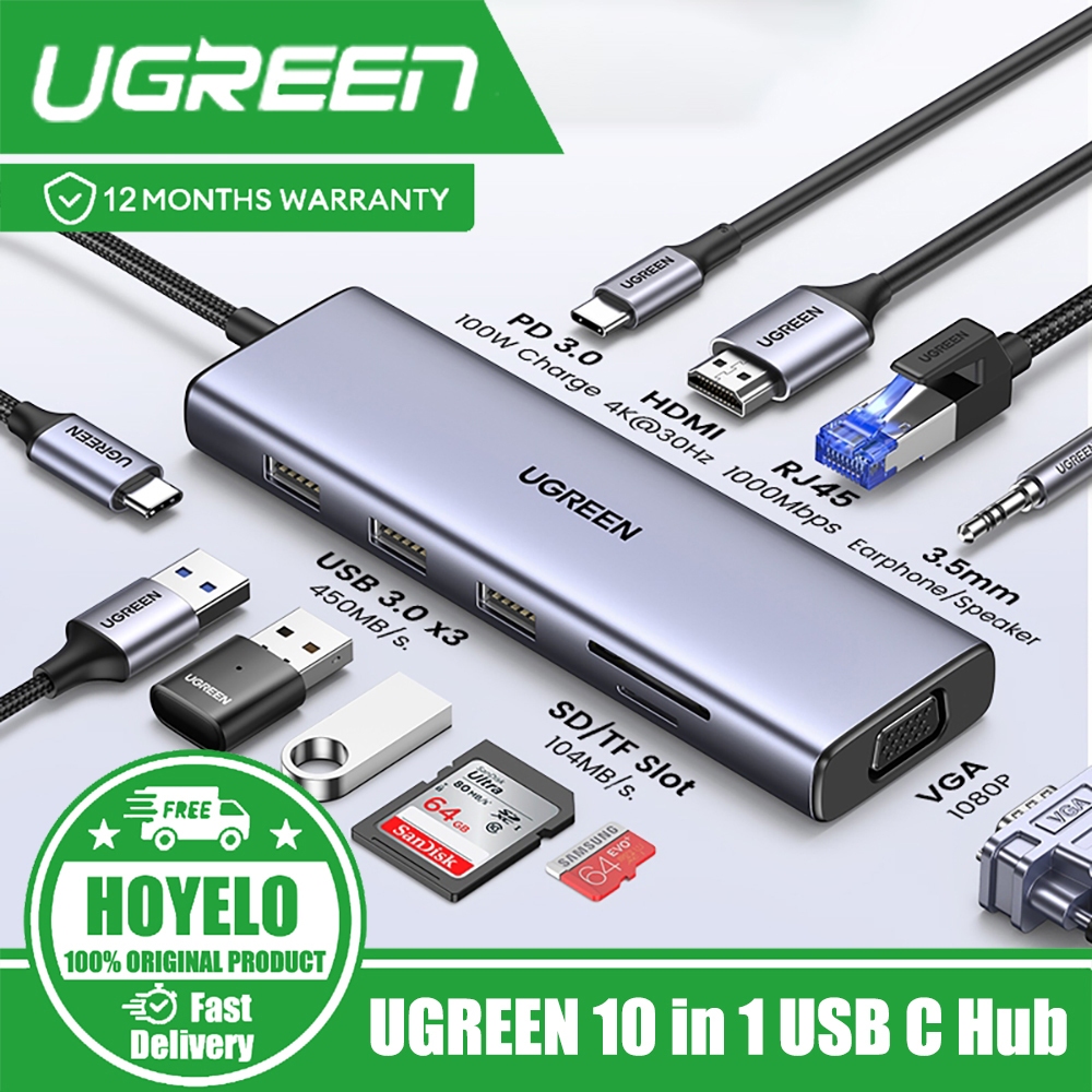 UGREEN 10 in 1 USB C Hub mobile base 4K HDMI VGA 100W power transmission 3 USB port 3.0 TF card reader