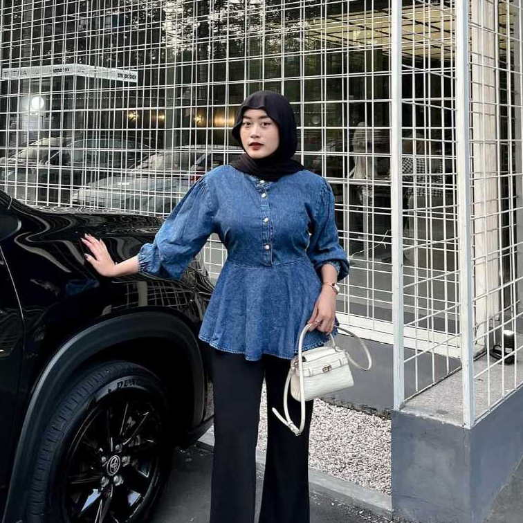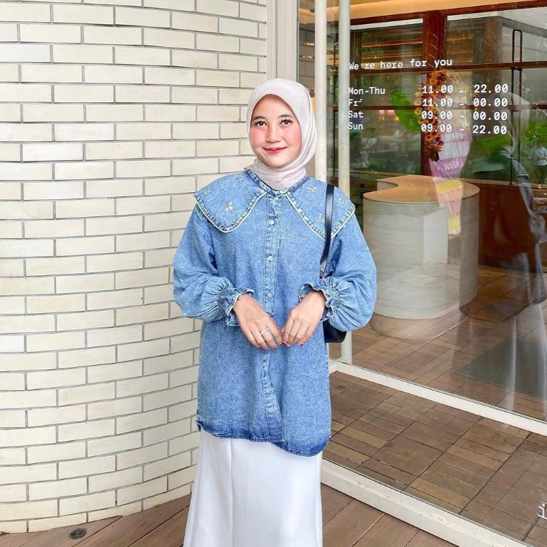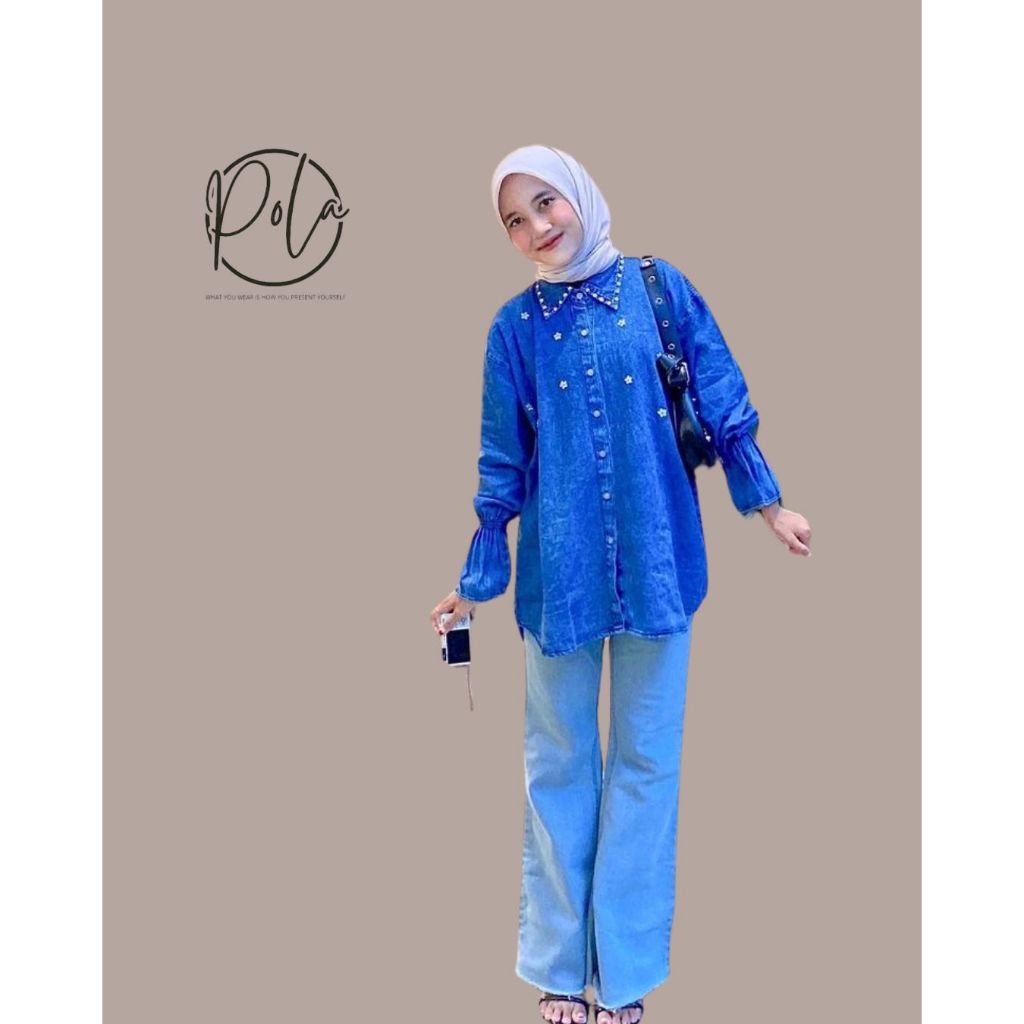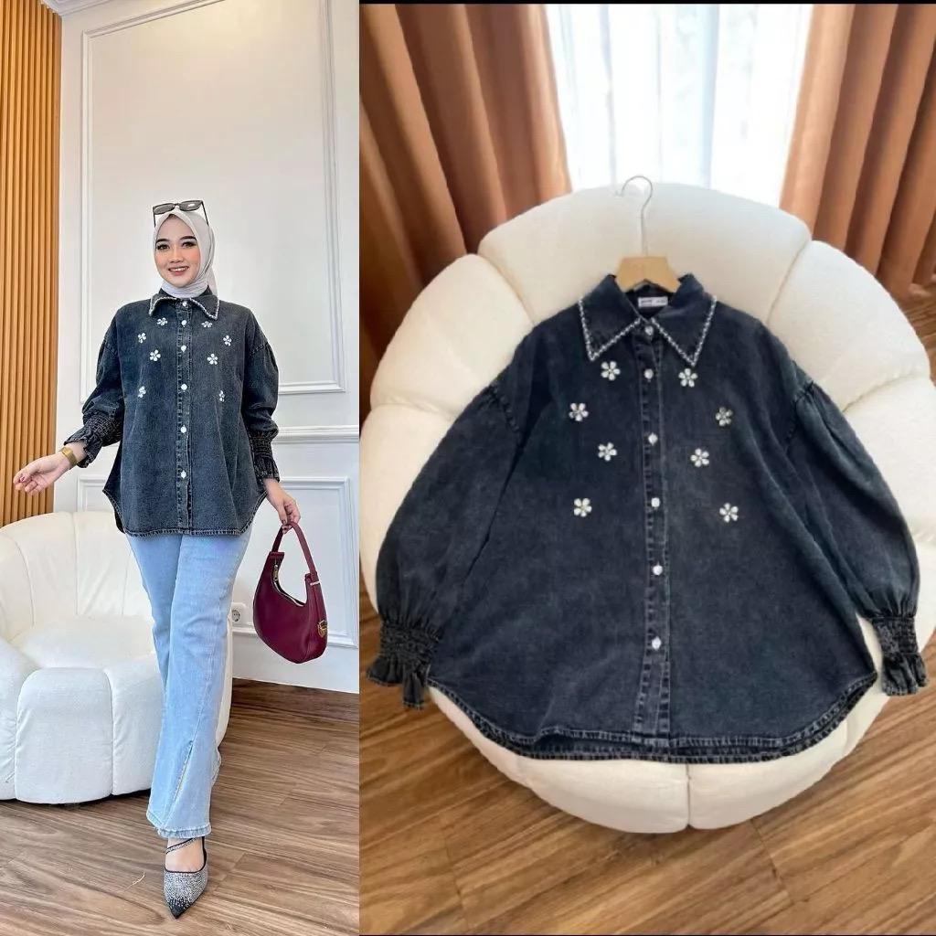 KEMEJA Pattern Wear Twyla Women's Jeans Shirt Sequin Oversize Denim Top Elastic Sleeve Blouse Women Korean Style Cute Blouse Kemeja Perempuan