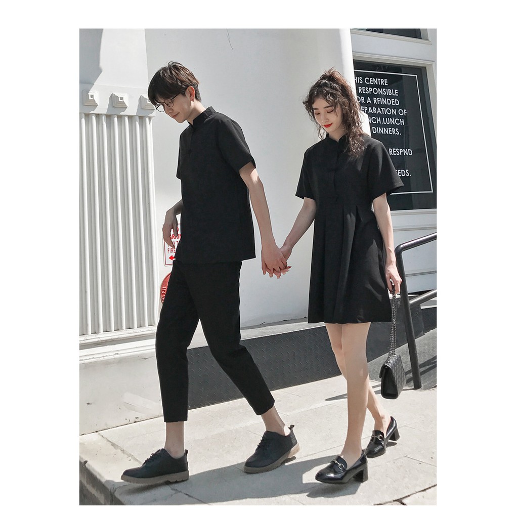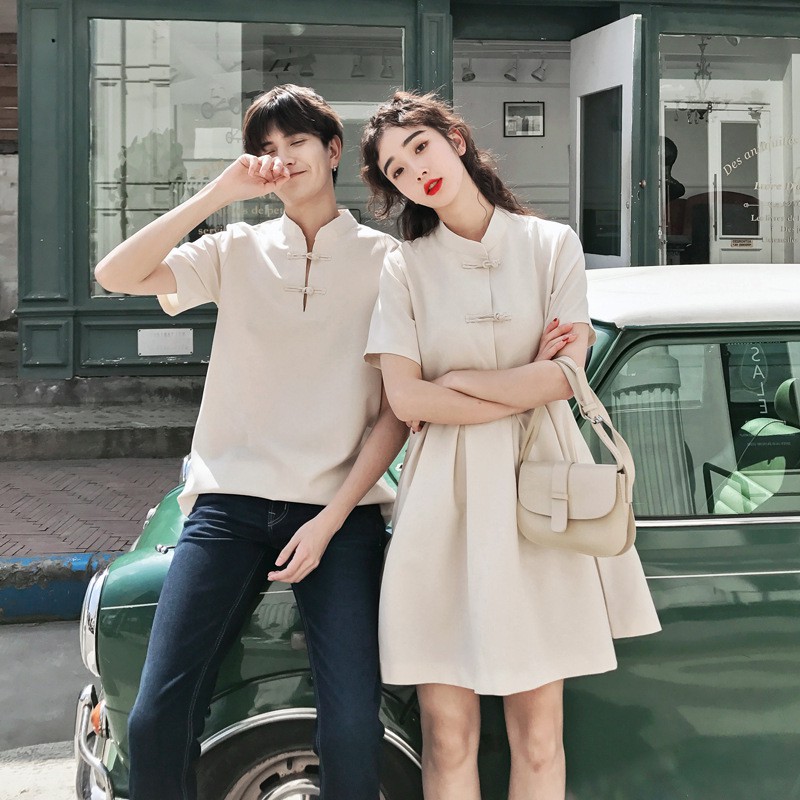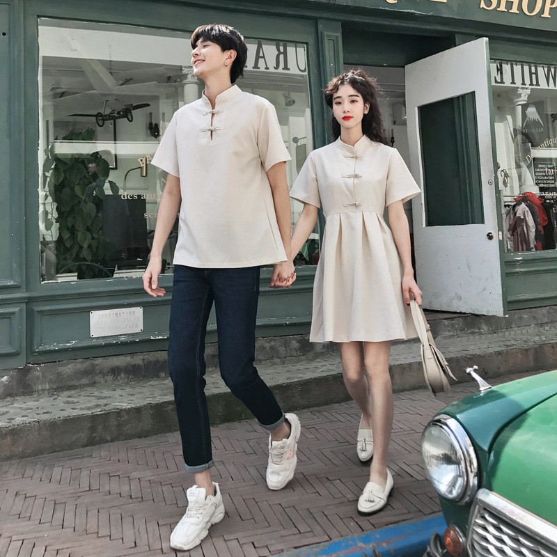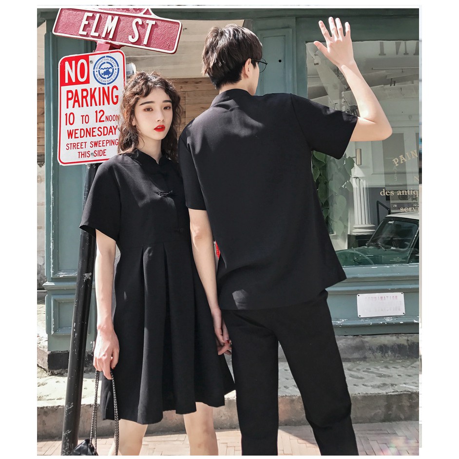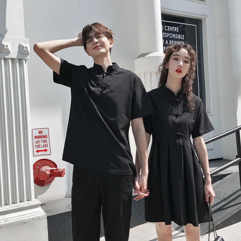 【XIAO】Couple set summer cheongsam short sleeve women buckle dress men shirt