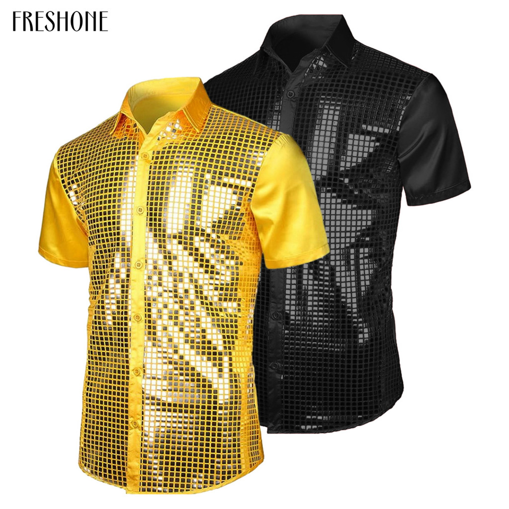 Breathable Men Shirt Sequined Short Sleeve Shirt Men's Shiny Satin Performance Shirt for Club Party Disco Stage Show Turn-down Collar Long Sleeves Single-breasted Buttons