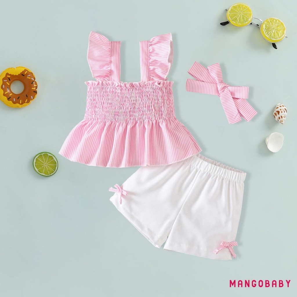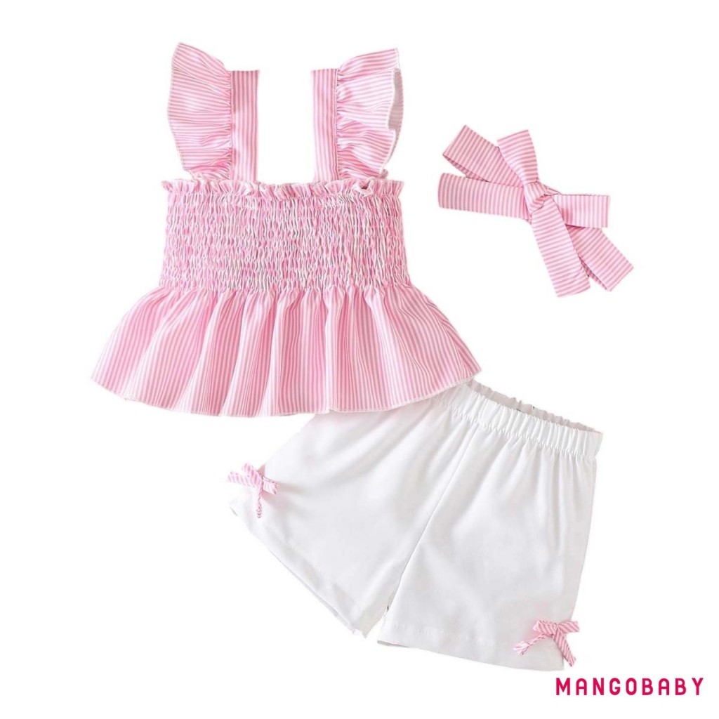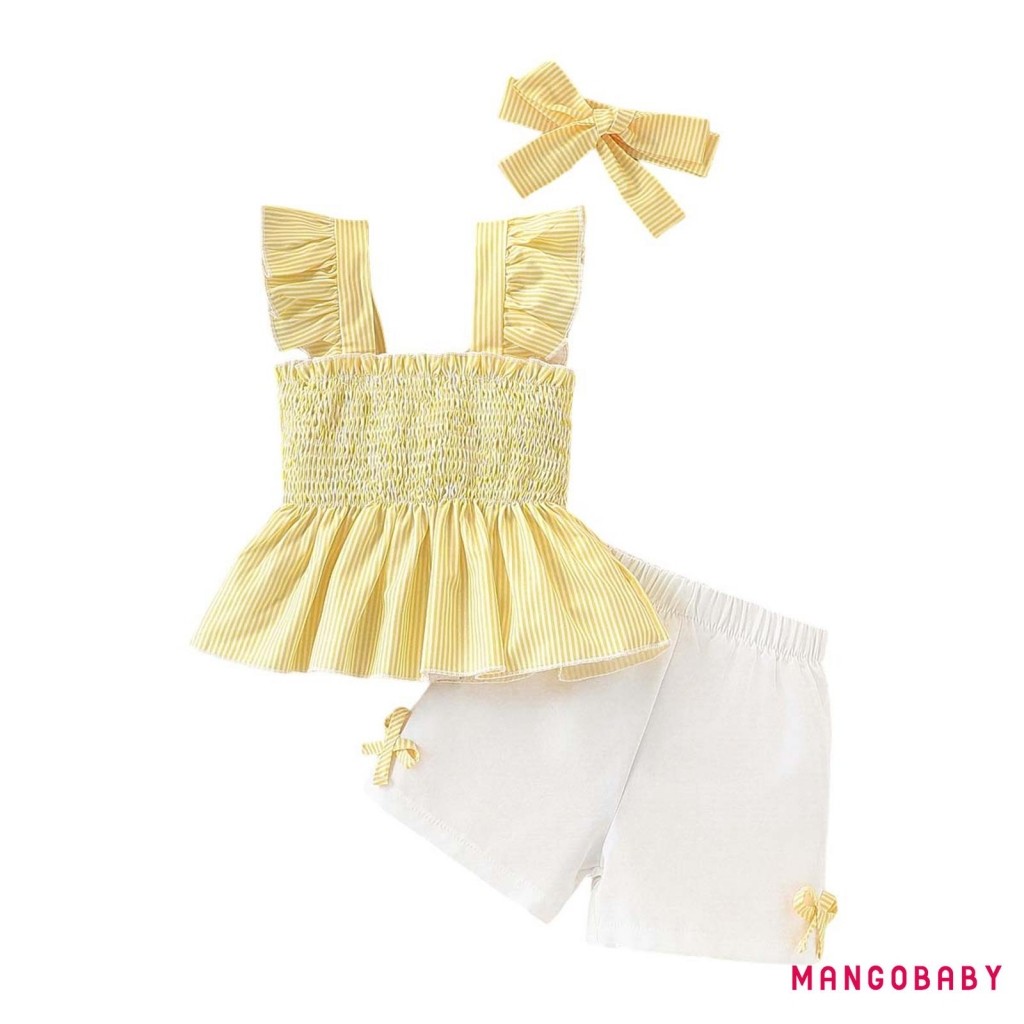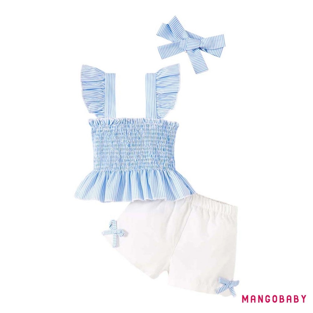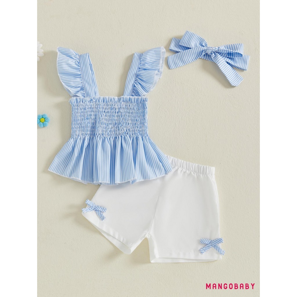 MANGO-Baby Girls Summer Outfits Striped Smock Fly Sleeves Tank Tops and Elastic Shorts Headband Set 3 Piece Clothes