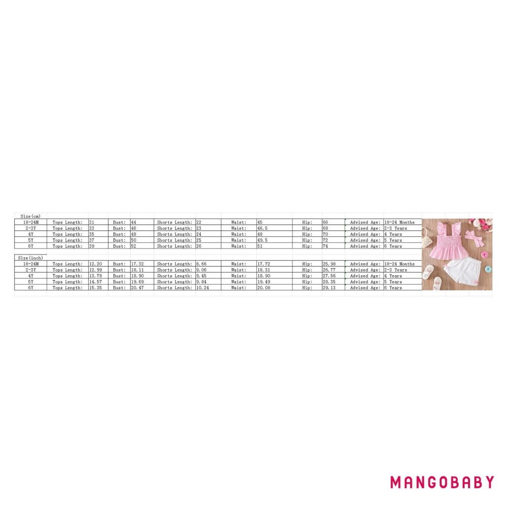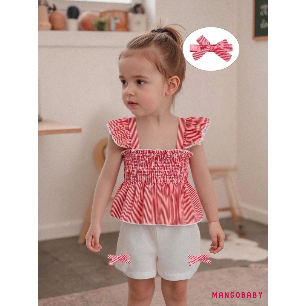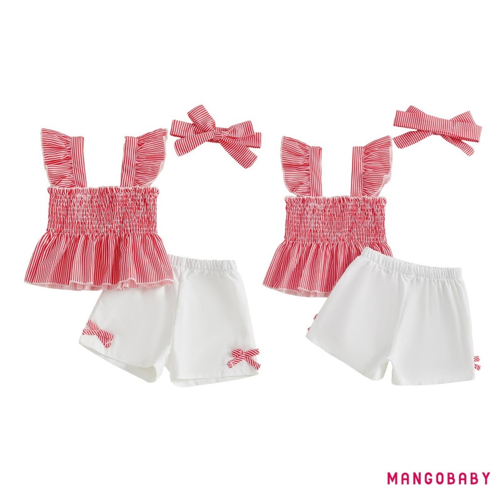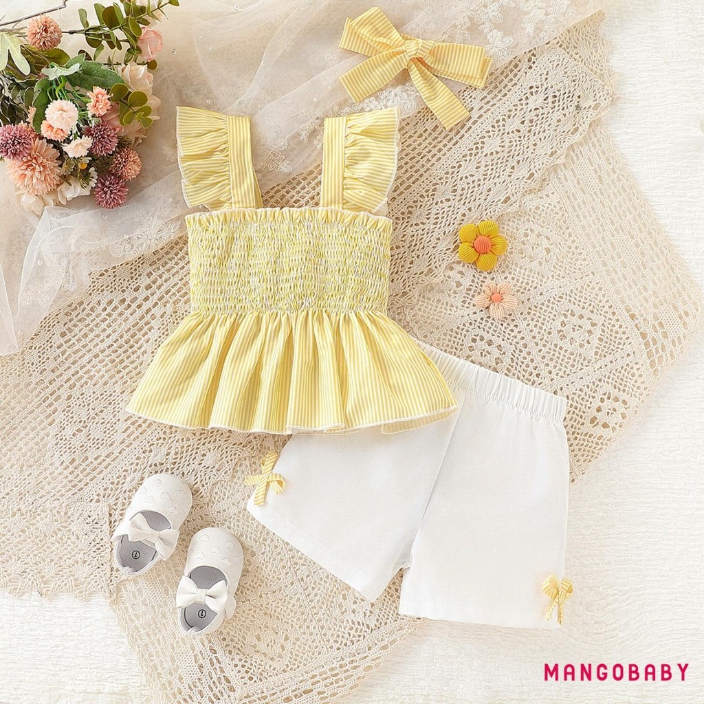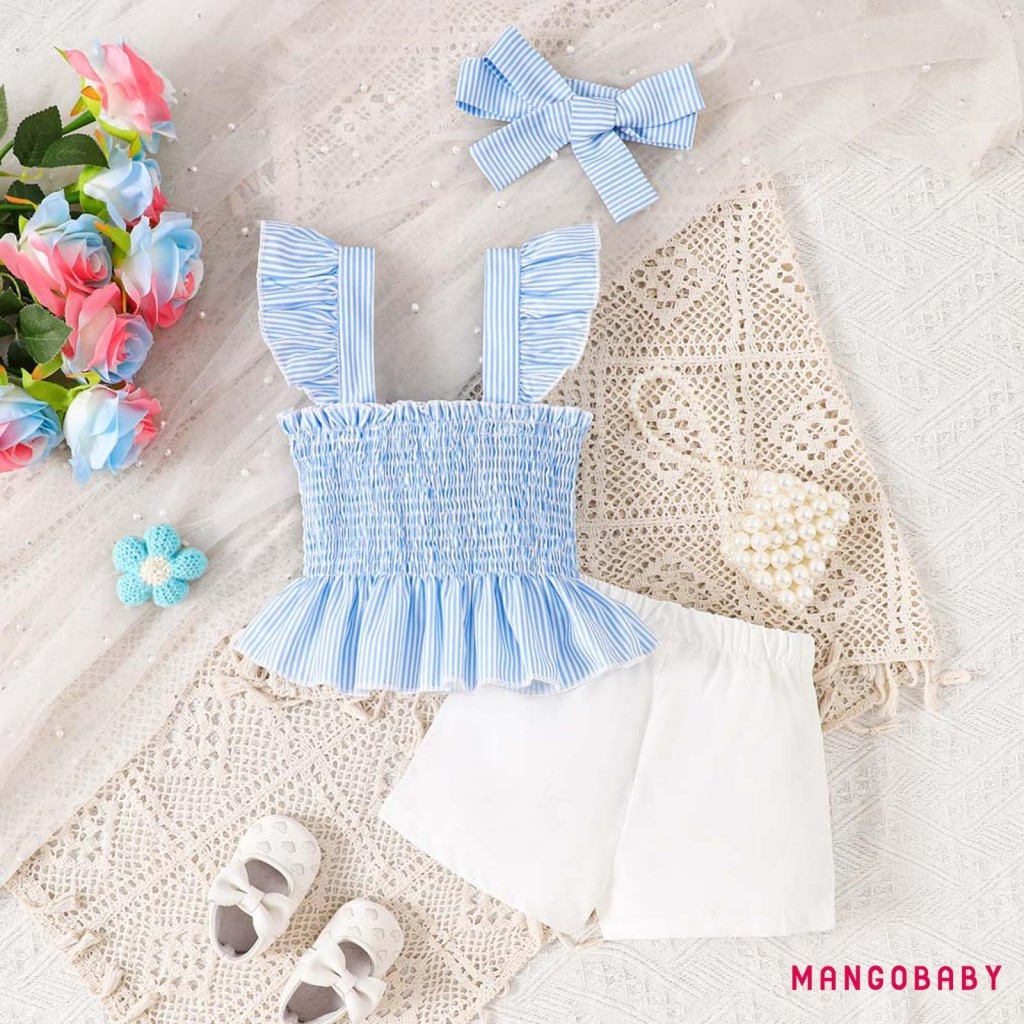 MANGO-Baby Girls Summer Outfits Striped Smock Fly Sleeves Tank Tops and Elastic Shorts Headband Set 3 Piece Clothes