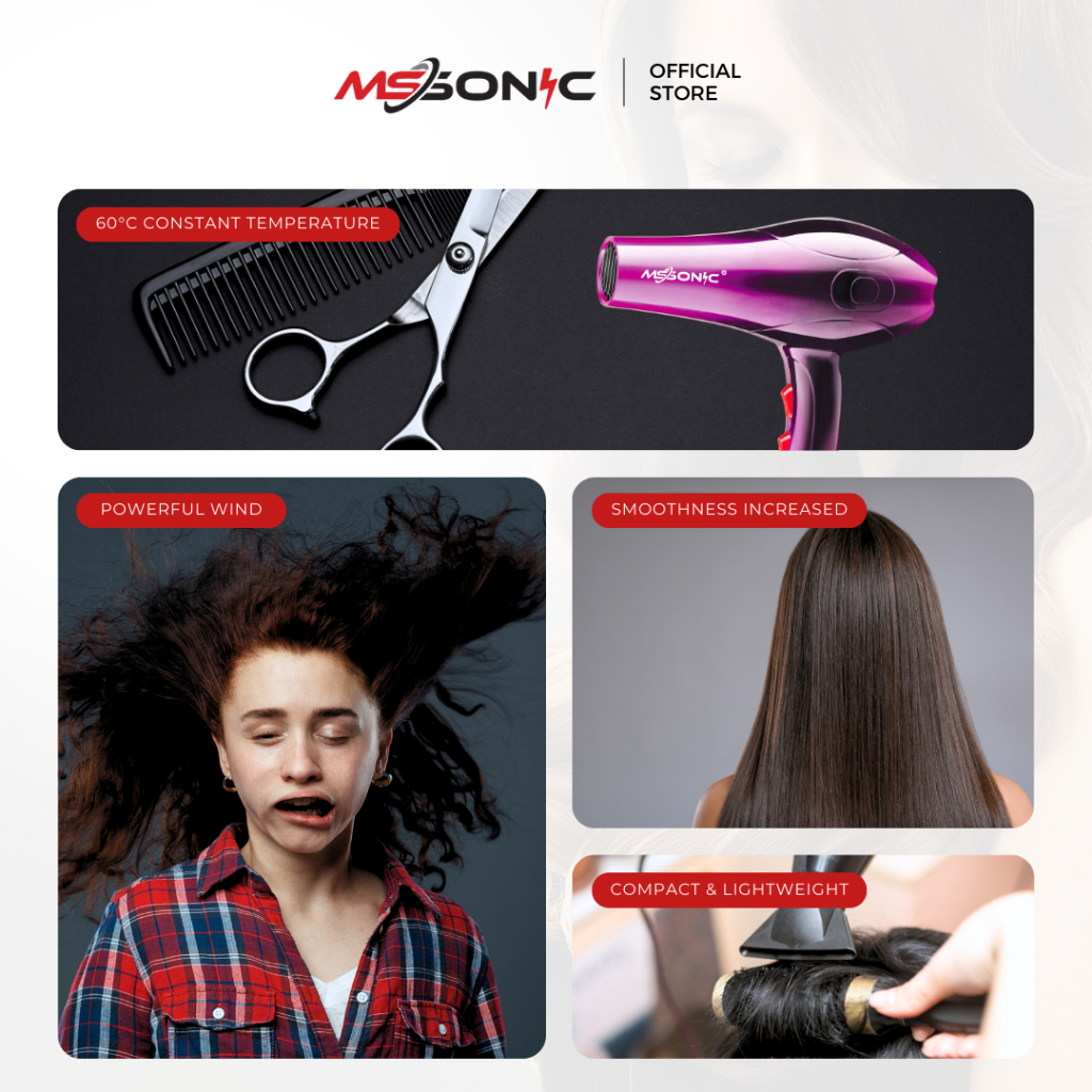 MS SONIC Professional Blow Hair Dryer Strong Wind Fast Dry Low Noise Pengering Rambut 800 Watt