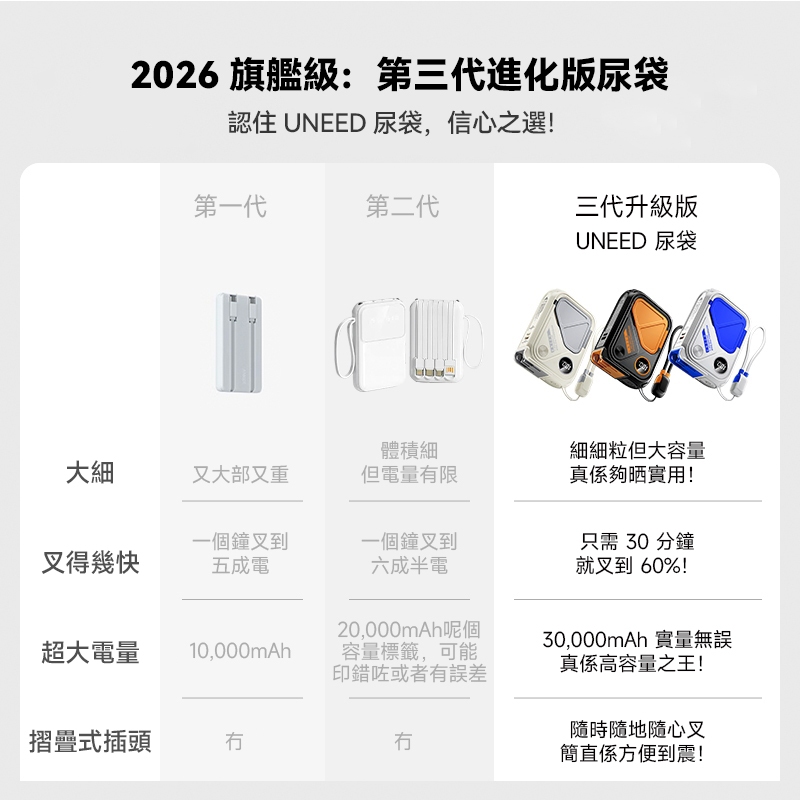 【加送旅行轉接頭+磁吸咭套】Uneed Powerbank 20000mah Fast Charging 35W PD 快充六合一尿袋自帶火牛插頭22.5W 無線充電行動電源,兼容 iPhone 8-17 及安卓設備