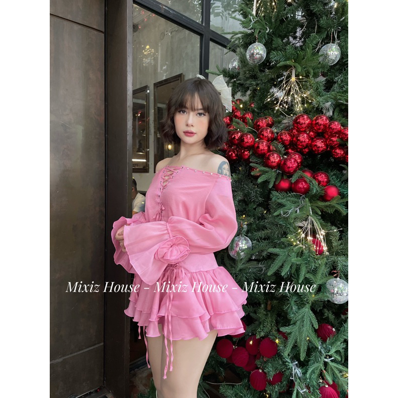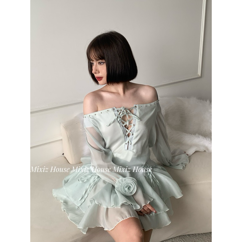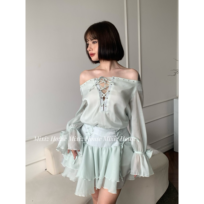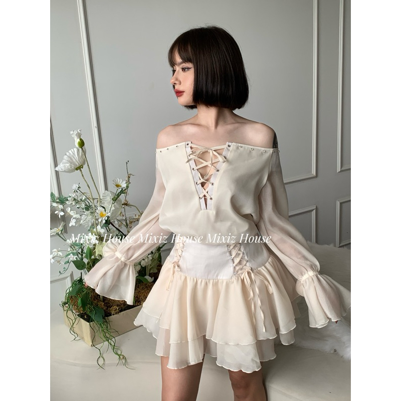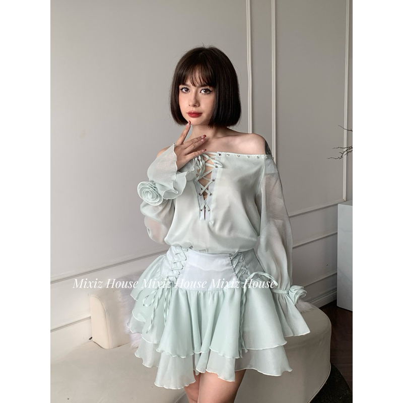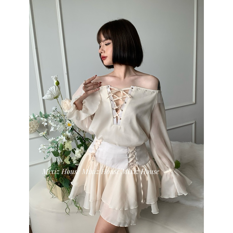 Mixiz House beaded knit top Set with cream blue knit waist skirt
