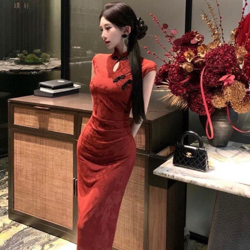 Summer Chinese Style Festive Red Mid-Length Dress Cheongsam for Annual Meetings