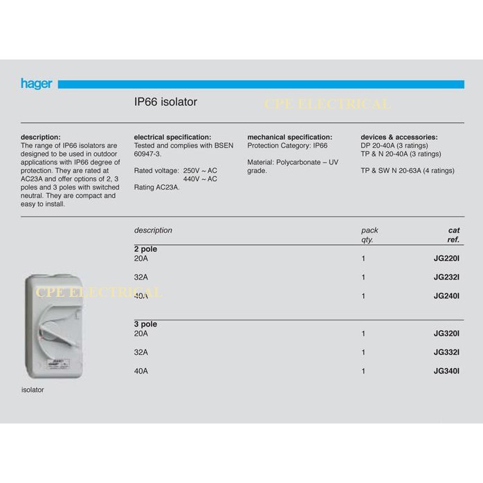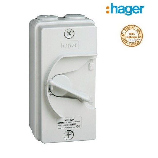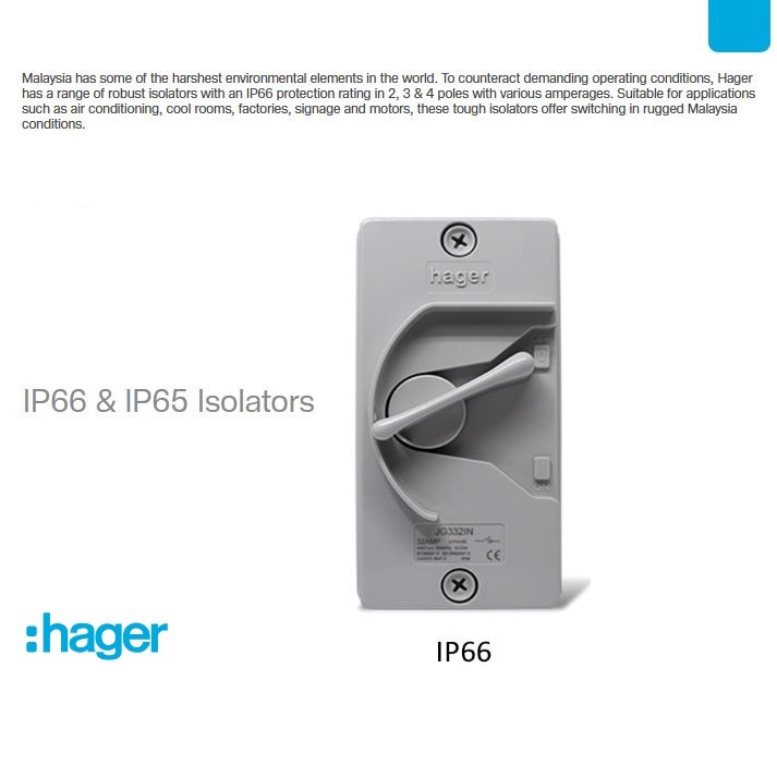 HAGER JG 20A 32A 40A 2 / 3 / 4 POLE ISOLATOR IP66