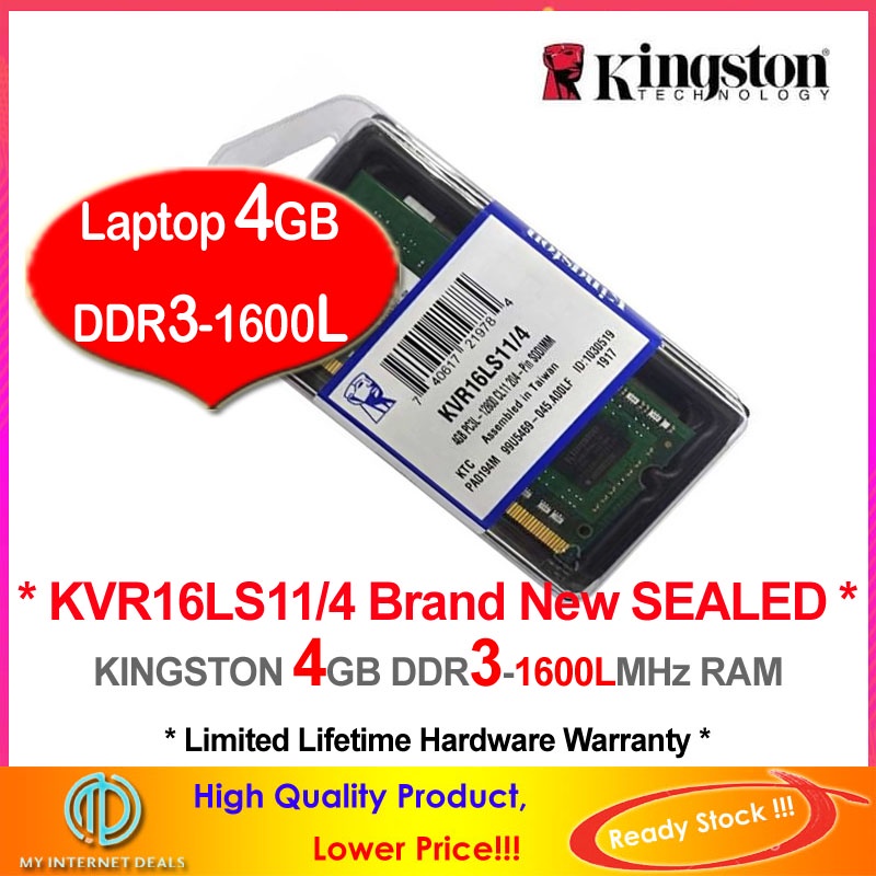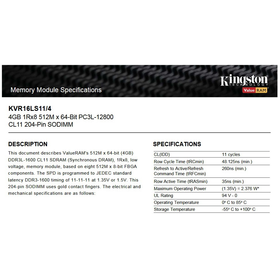KINGSTON 4GB DDR3-1600L LAPTOP NOTEBOOK RAM Memory (KVR16LS11/4)
