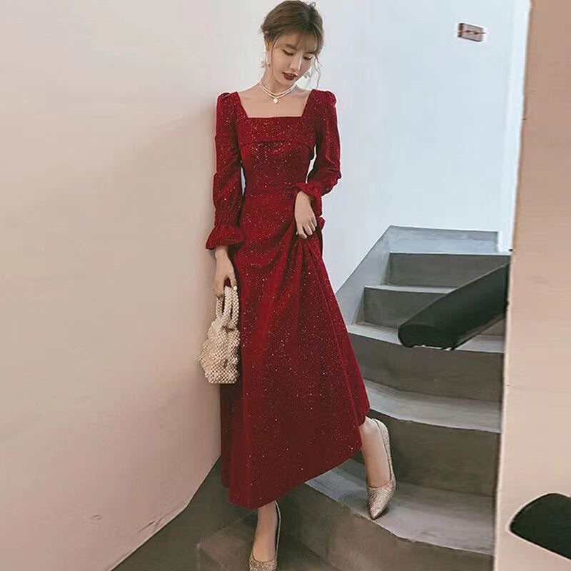 New style small dress long elegant temperament square collar wine red dress waist slimming can be worn everyday