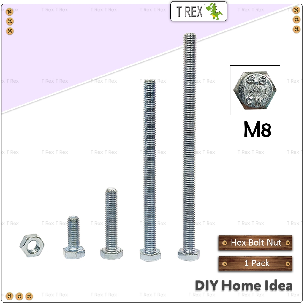 T Rex DIY M8 Hex Bolt & Nut Zinc Plated / Mild Steel Fastener / Rust Resistant Skru Kepala Heksagon