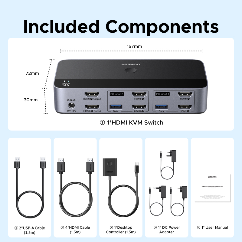 UGREEN 4K 60Hz HDMI KVM Switch 2 PCs 2 in 2 Out USB C USB 3.0 Share Monitor Keyboard Mouse HDR 3D Display for Laptop Desktop
