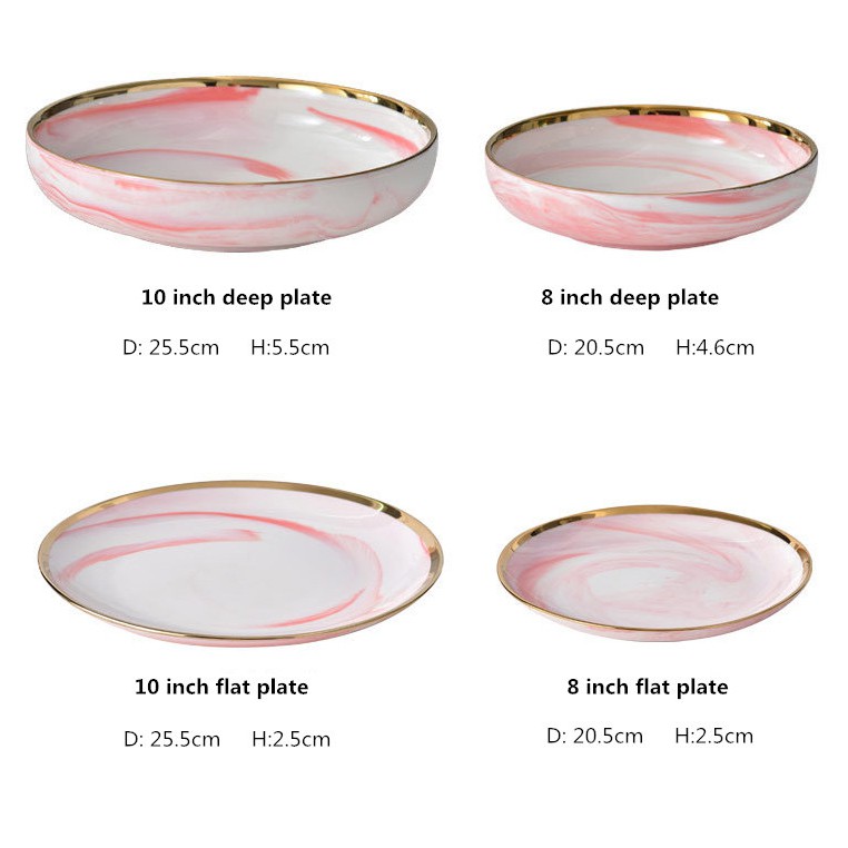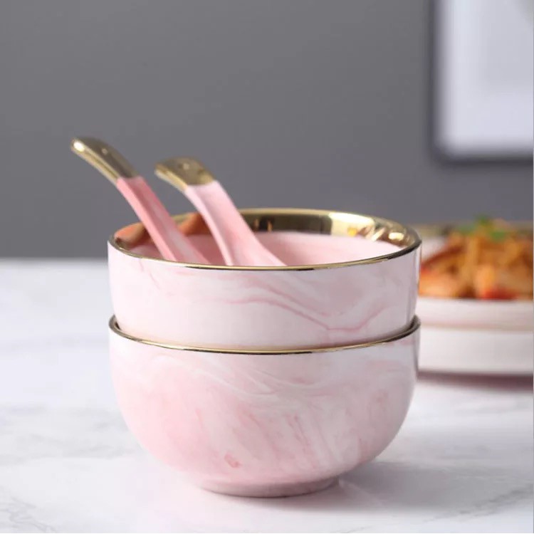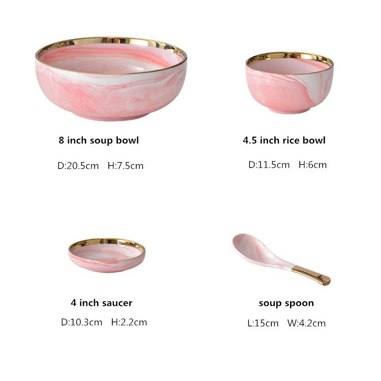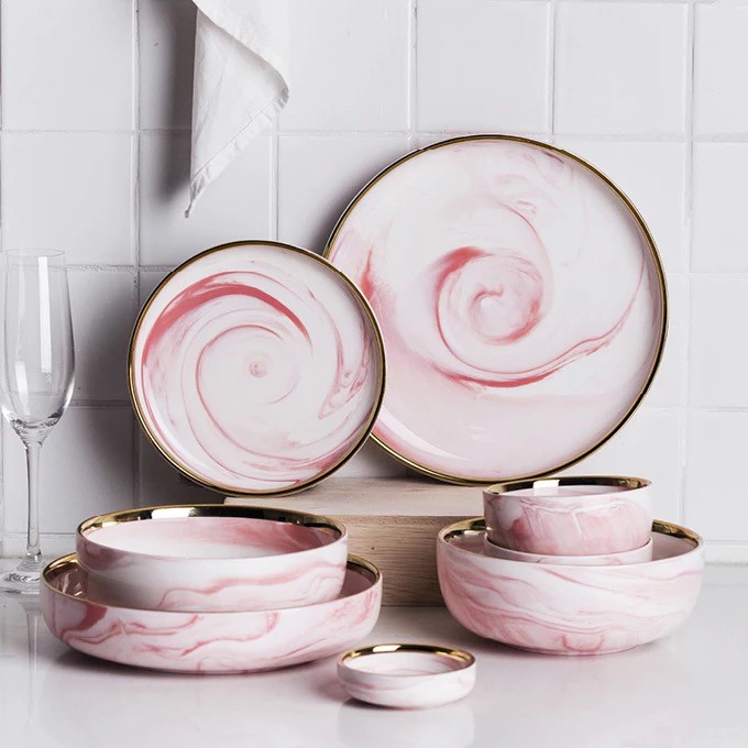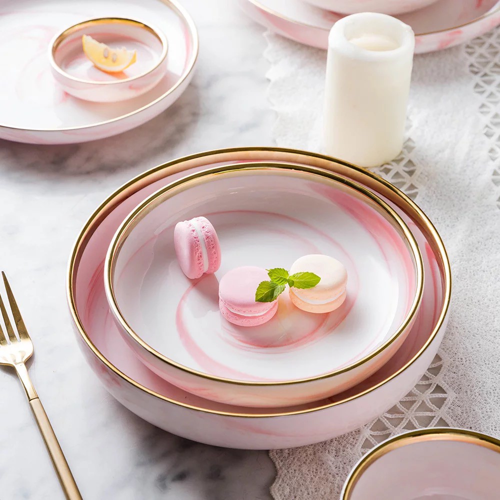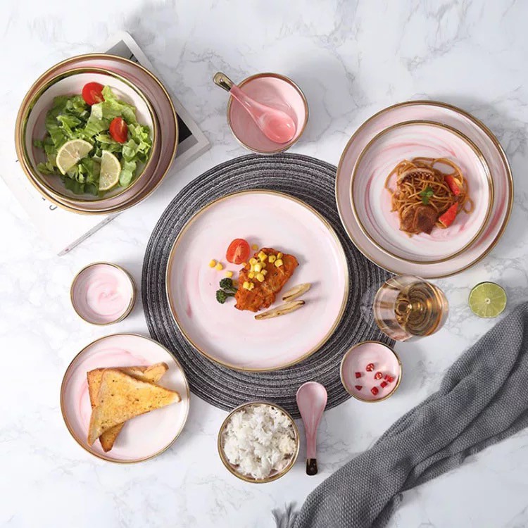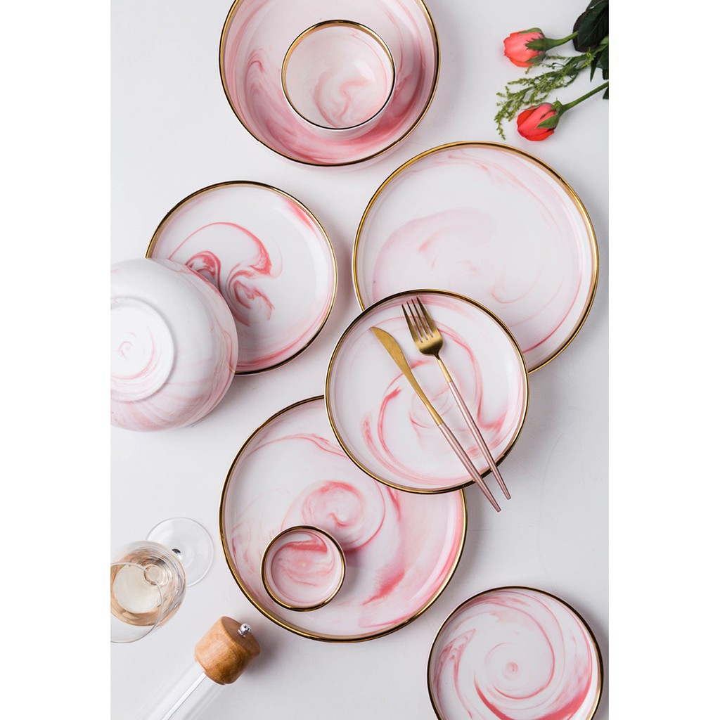 Pink Marble Ceramic Dinnerware Set Gold Rim Dinner Plate Rice Bowl Sauce Dish Tableware
