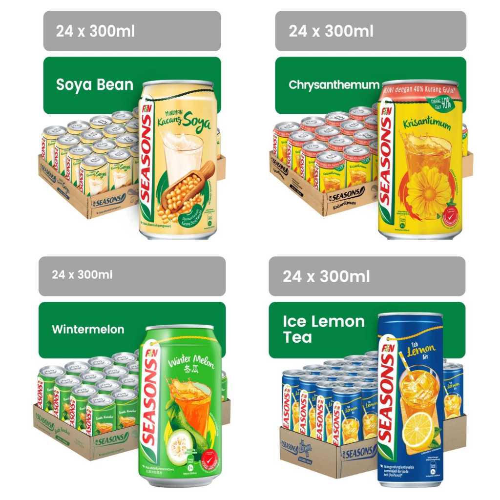 F&N Seasons Can Chrysanthemum / Ice Lemon Tea/ Soya Bean/ Grass Jelly Air Tin 300ml x 24