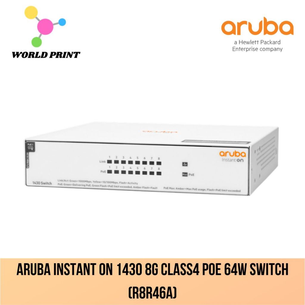 HPE Networking Instant On 1430 8G Class4 PoE 64W Switch 8 RJ-45 autosensing Class4 PoE 10/100/1000 ports (R8R46A)
