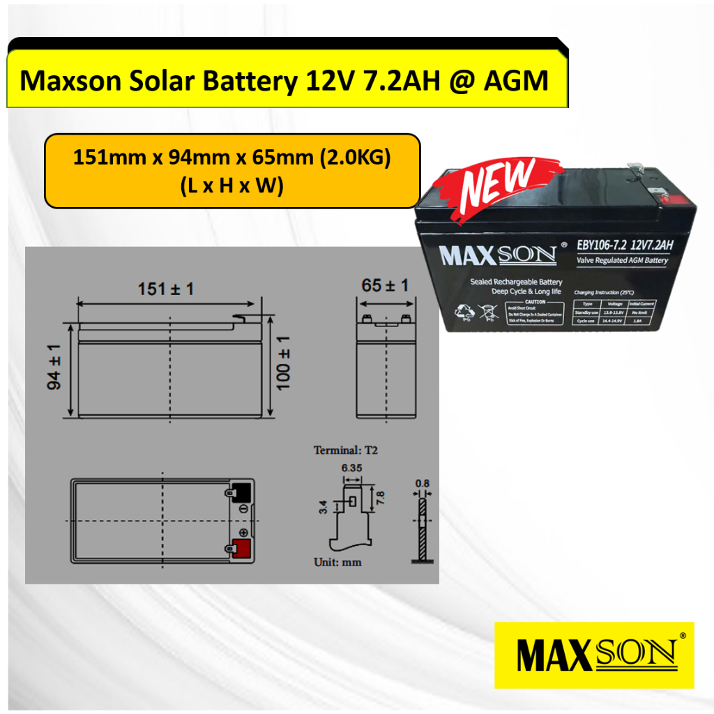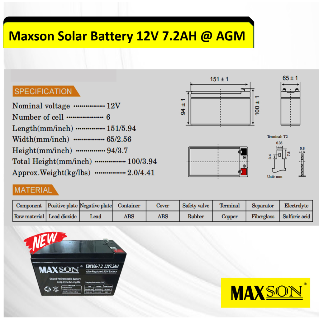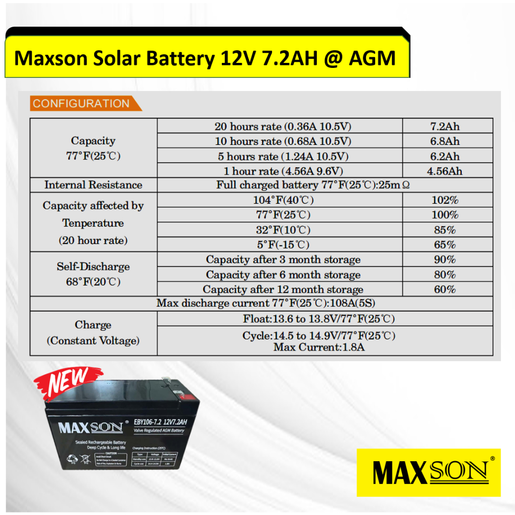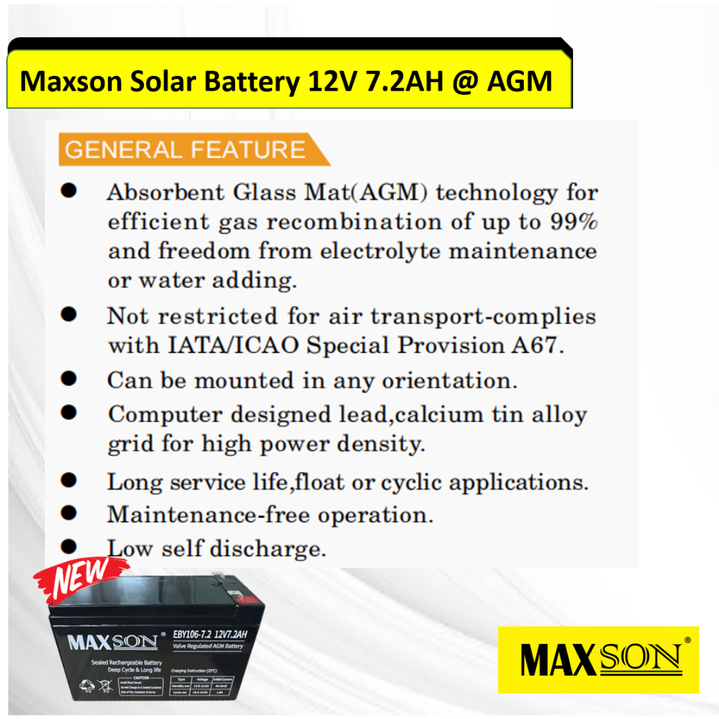 MAXSON Solar Battery 12V 7.2AH @ AGM New!! (HANYA UNTUK SEMENANJUNG MALAYSIA)