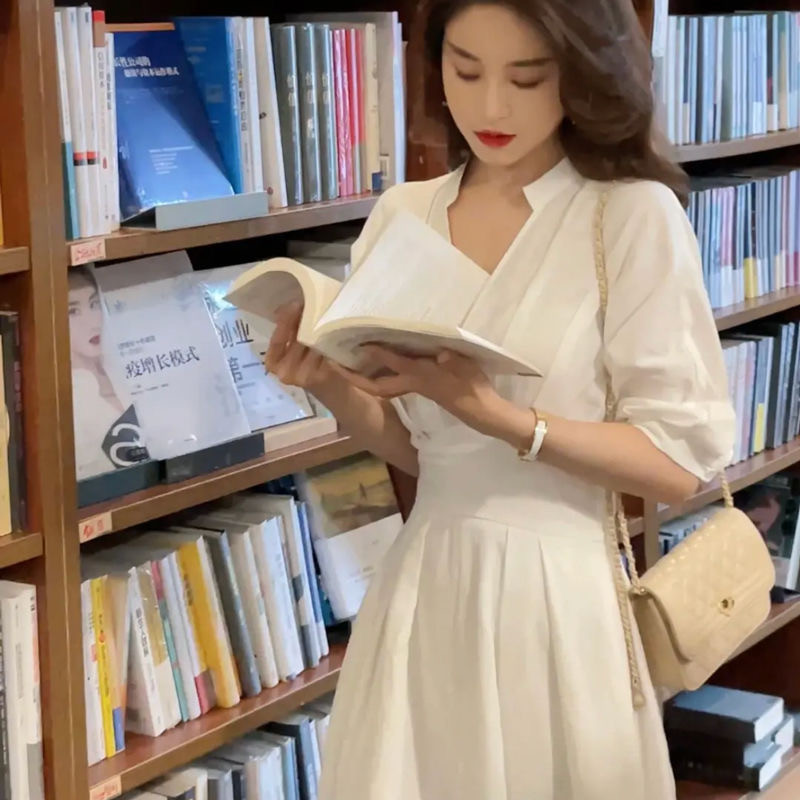 Niche Design High-End Dress Women Summer White v-Neck Design Classy Fashion Slimmer Look Mid-Length Skirt