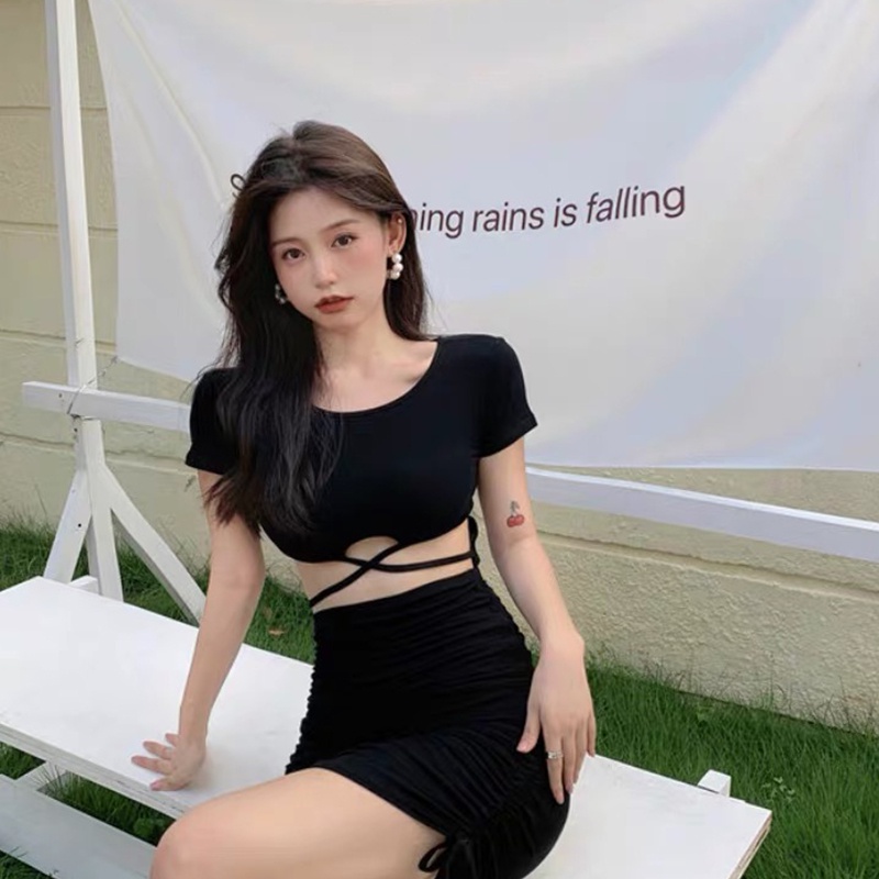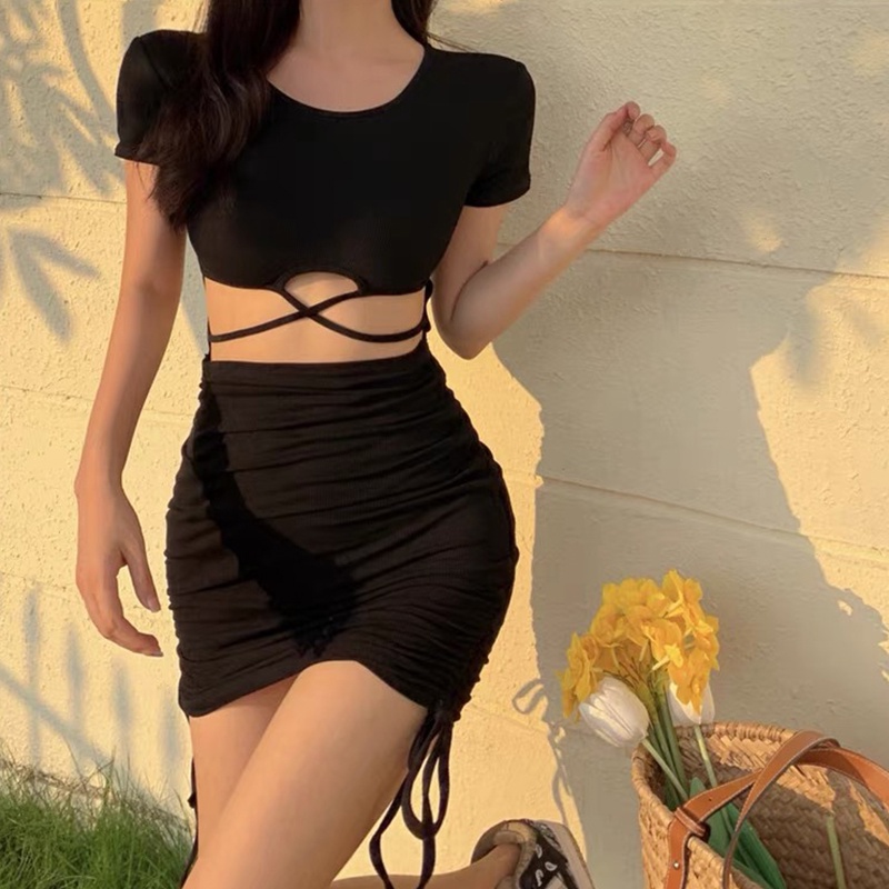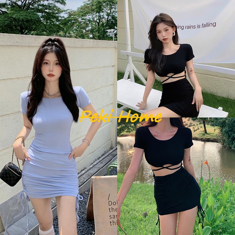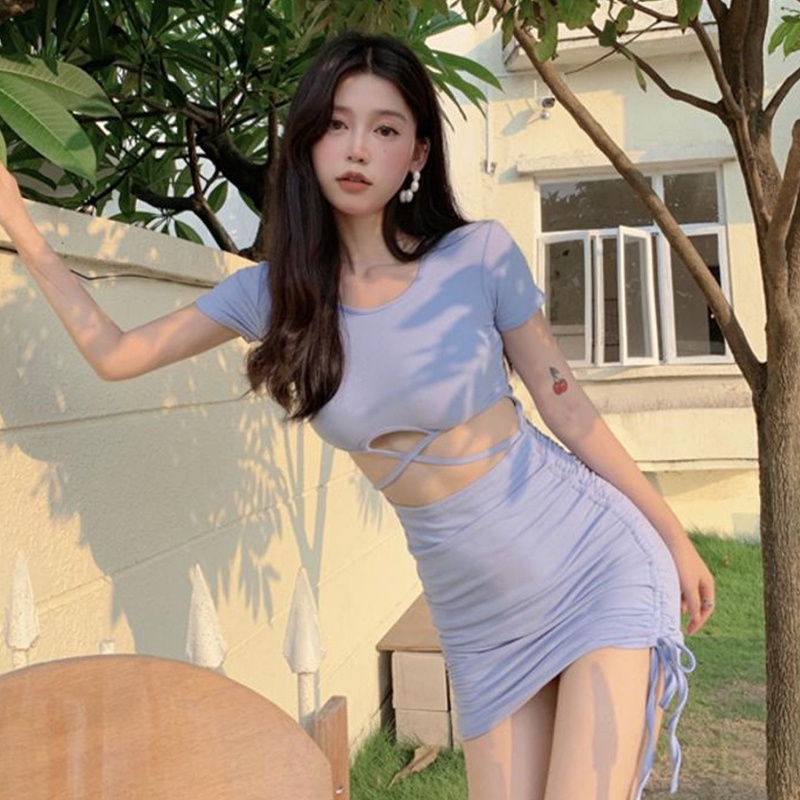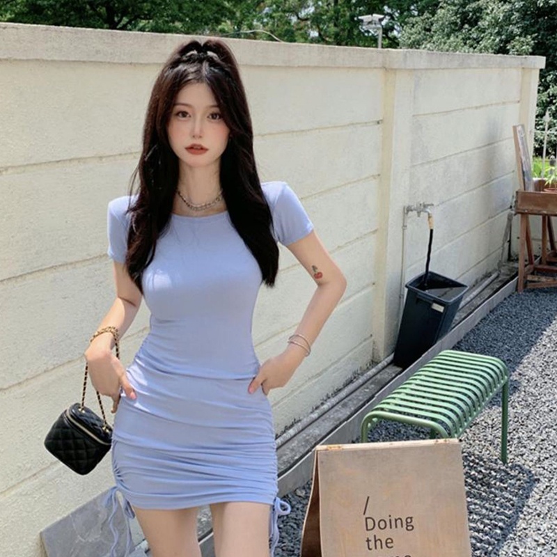 Sexy Dress Fashion Short Skirt Tight Beautiful Design Side Drawstring Sleeve Round Neck