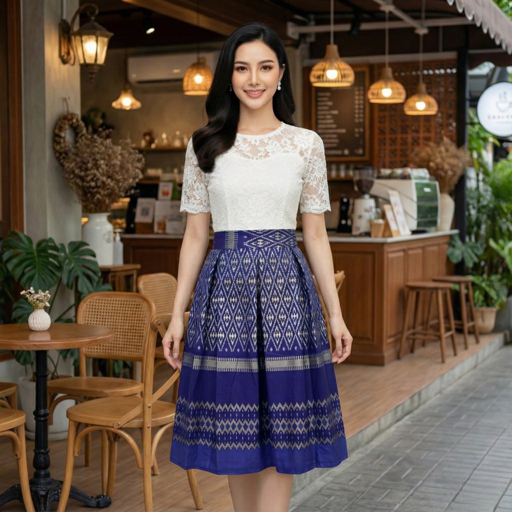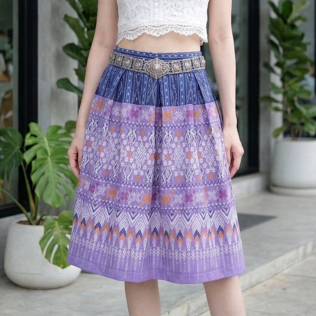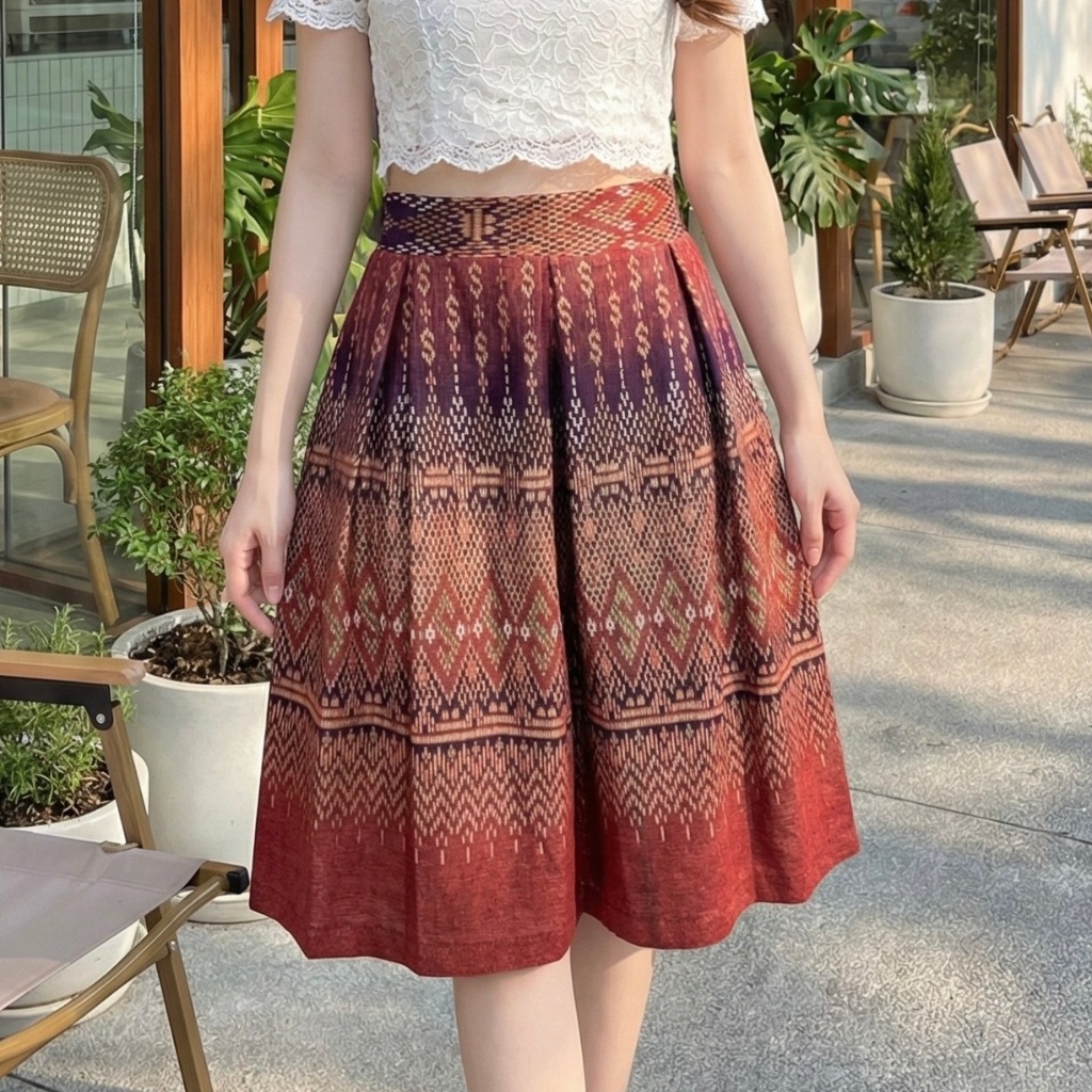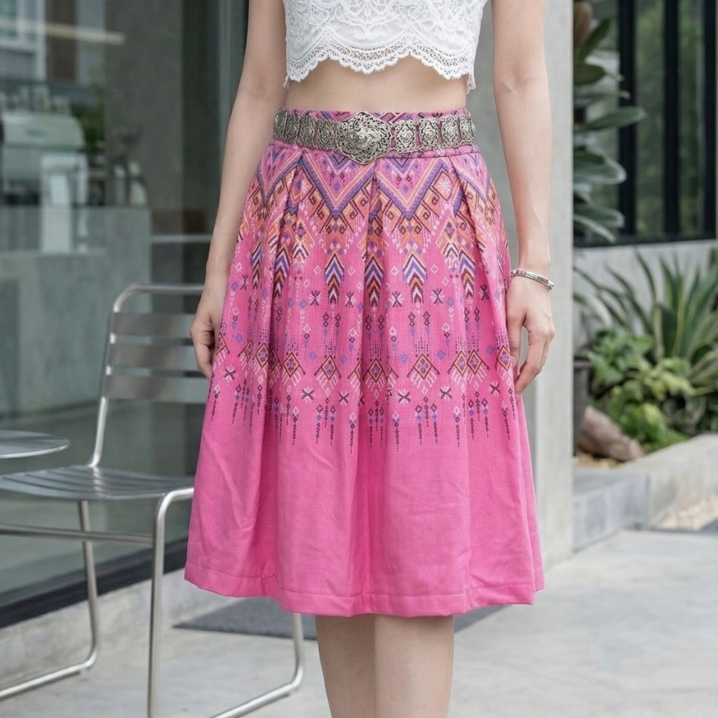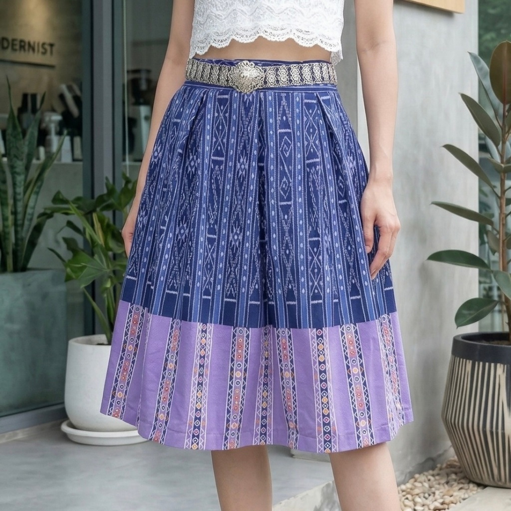 Thai Silk Skirt Twich Style Smocked Waist At The Back Midi Skirt