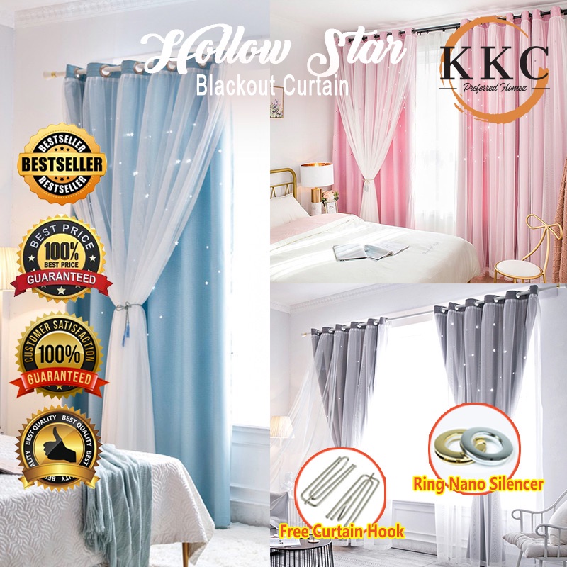 KKC Curtains Hollow Star Blackout Double Curtain (80%) mesh with Lace sheer Ship from Malaysia