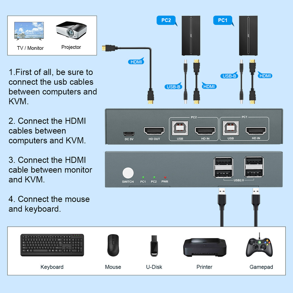 2 Port KVM Switches with 4K@60Hz USB 2.0 /USB 1.1 2 Computers 1 Monitor KVM Switch Plug and Play Support Hotkey Switching