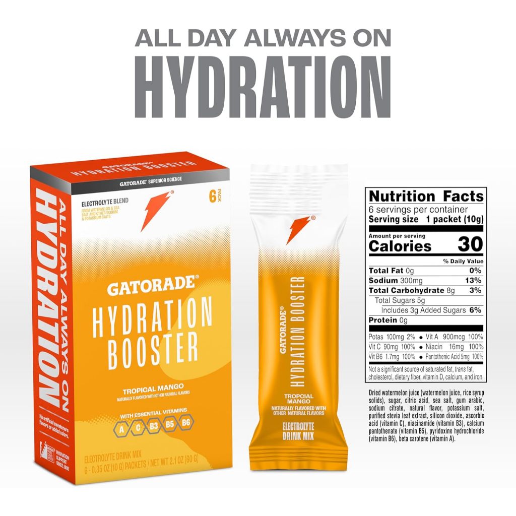 GATORADE Hydration Booster Advanced Electrolyte Drink Mix Vitamins Powder Packets, Tropical Mango, 1 Packet / 1 Box