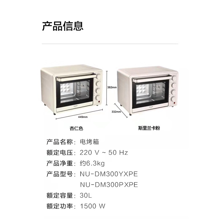 【松下 Panasonic】斯里兰卡粉 30L大容量 电烤箱 上下独立控温 立体均匀烘烤 三段下拉门 NU-DM300PXPE electric oven pink up and down independent temperature