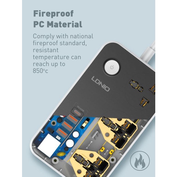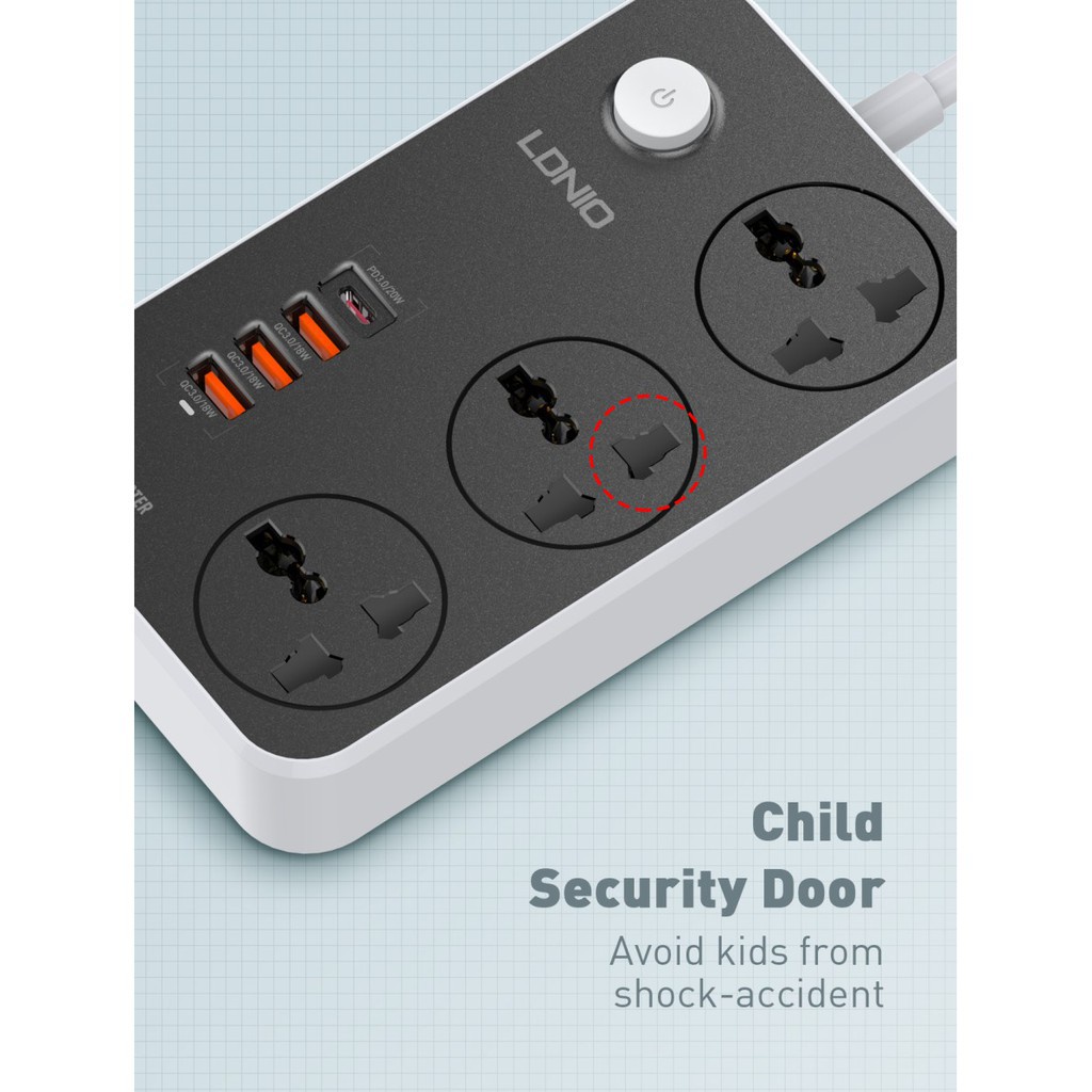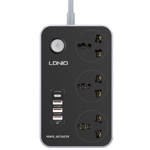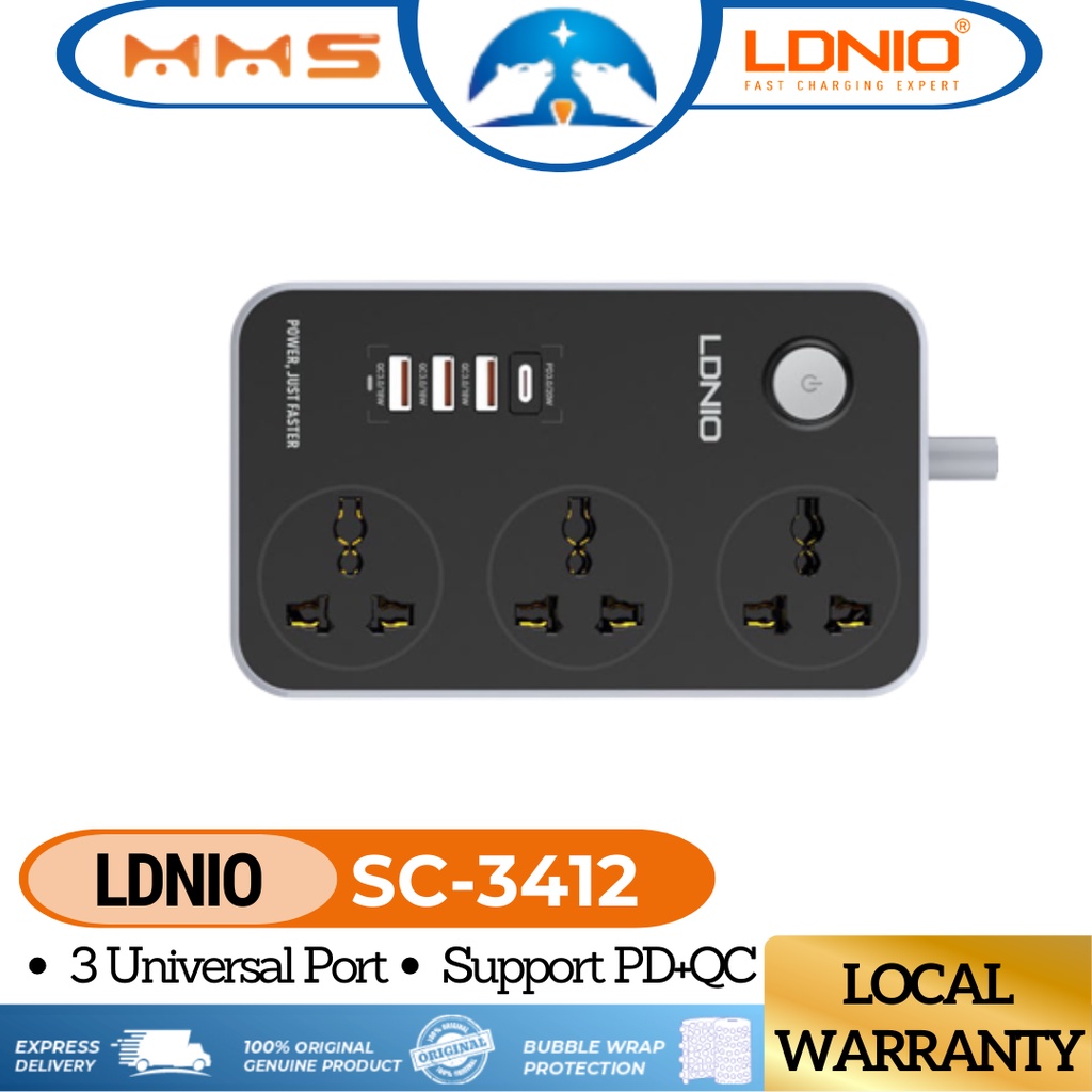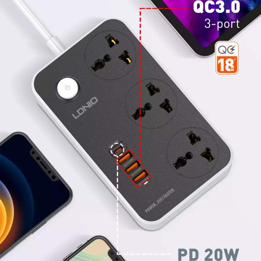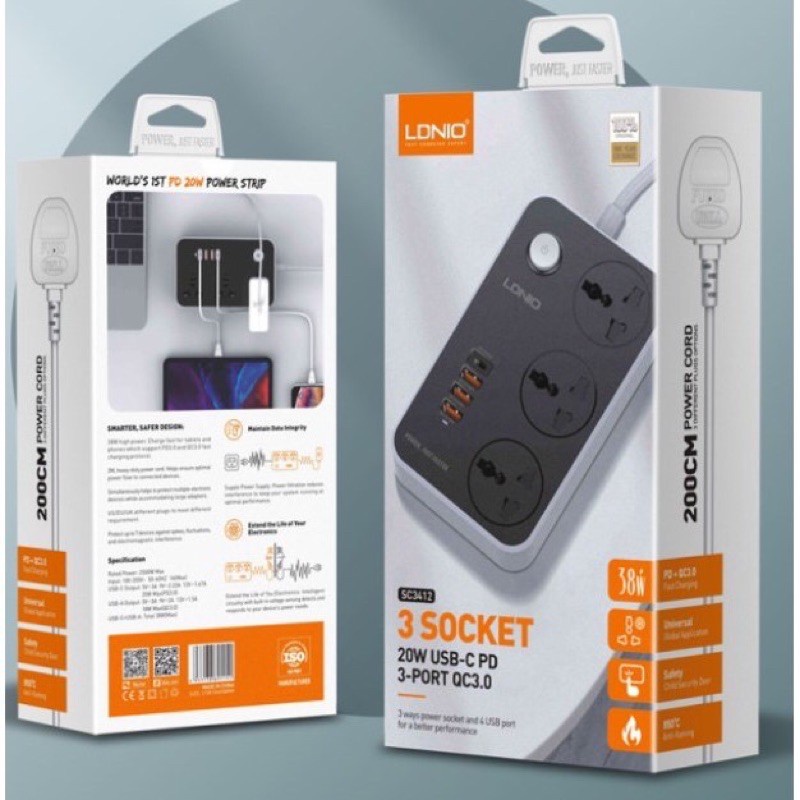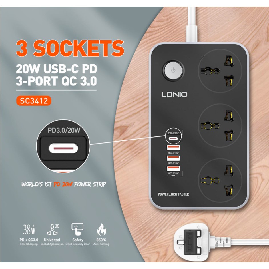 LDNIO SC3412 Upgrade - 3 Electrical Socket with 3 USB QC 3.0and 1 USB-C PD 20W 3 Socket Outlets and 3 QC 3.0 USB