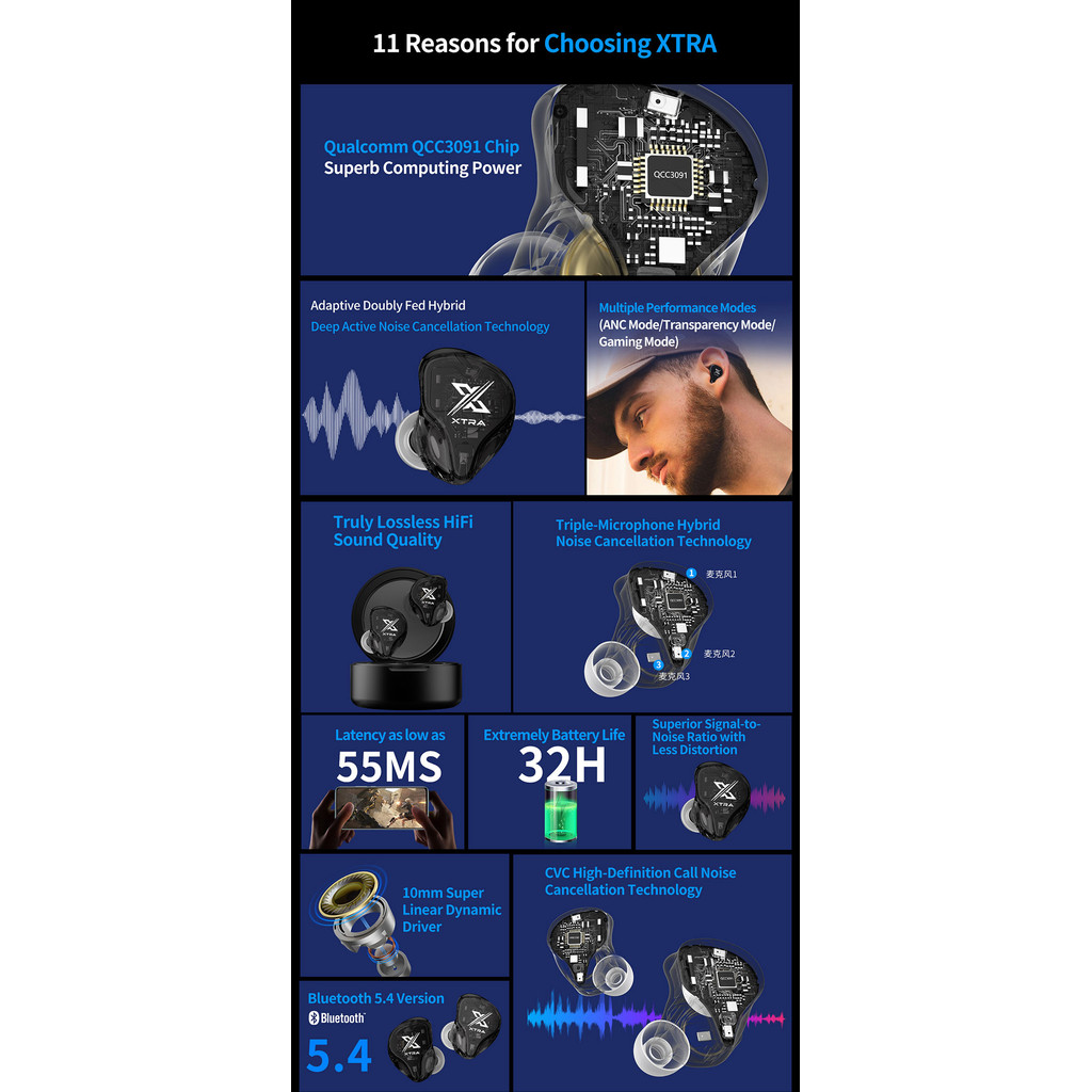 KZ Xtra TWS Noise Cancelling Bluetooth 5.4 Earphones True Wireless Earbuds Multi-Mode ANC QCC3091