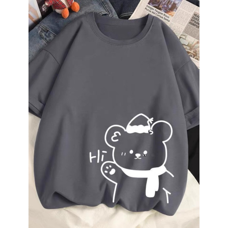 100% Cotton T-shirt Loose Short Sleeve Round Neck Bear Print 011 00280