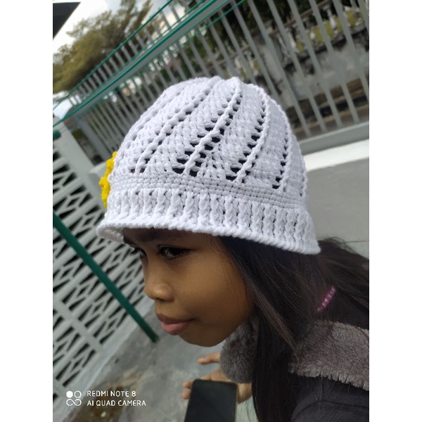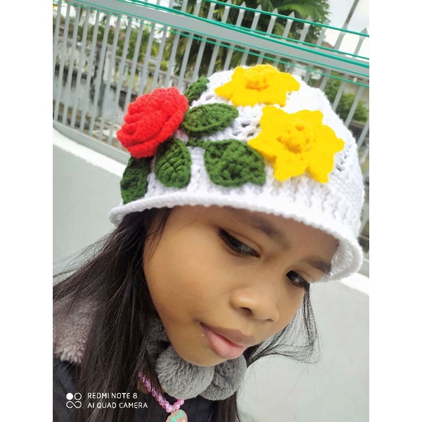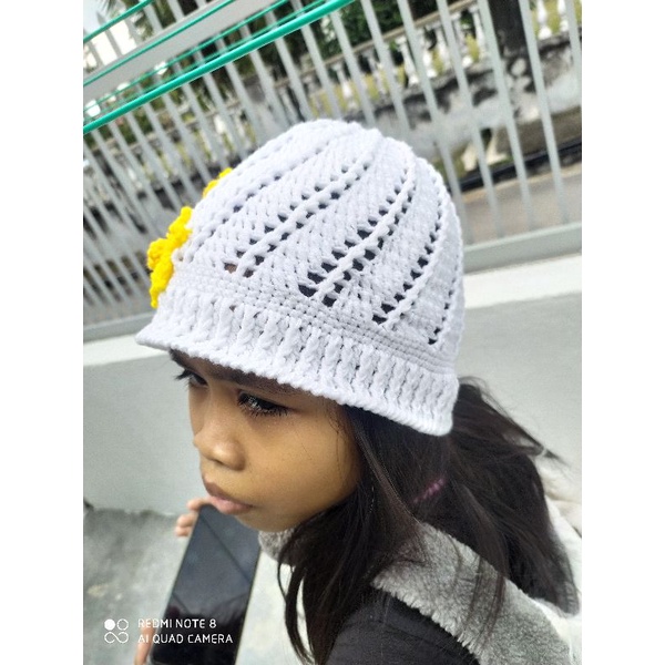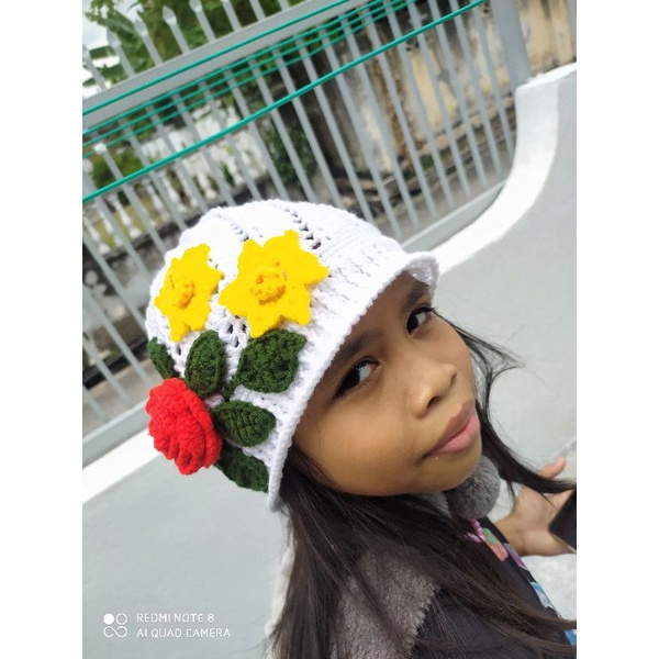 KIDS CHILDREN GIRLS FREE SIZE BENNIE HAT CAP WITH FLOWER 💯 HANDMADE CROSHET TOPI KANAK-KANAK FESYEN KAIT