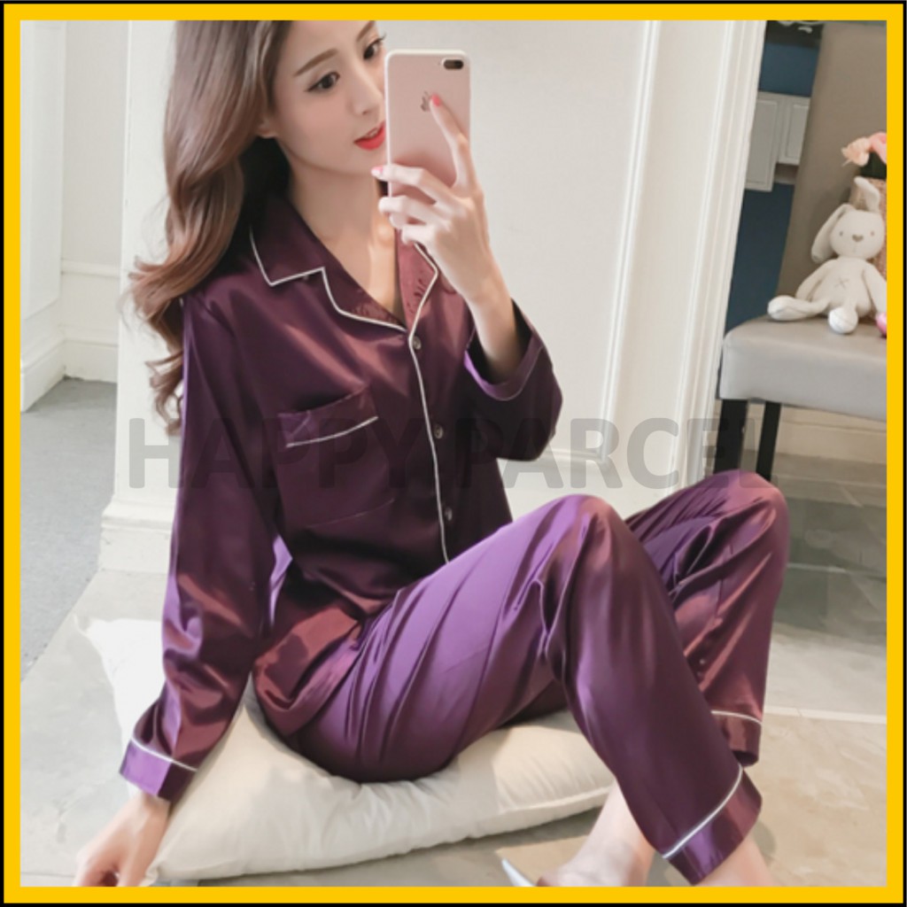 [M-5XL]Baju Tidur Unisex Silk Satin Lengan Panjang Pajamas Plus Size Baju Tidur Dewasa for Men Women Pyjamas Nightwear