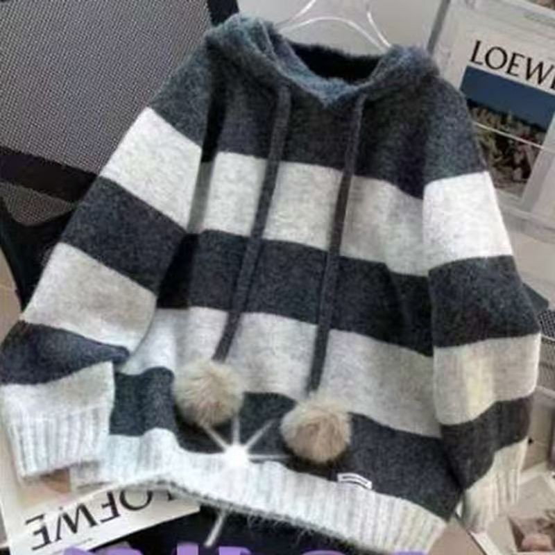 Korean Loose Hooded Striped Sweatear Autumn Winter New Knitted Sweater