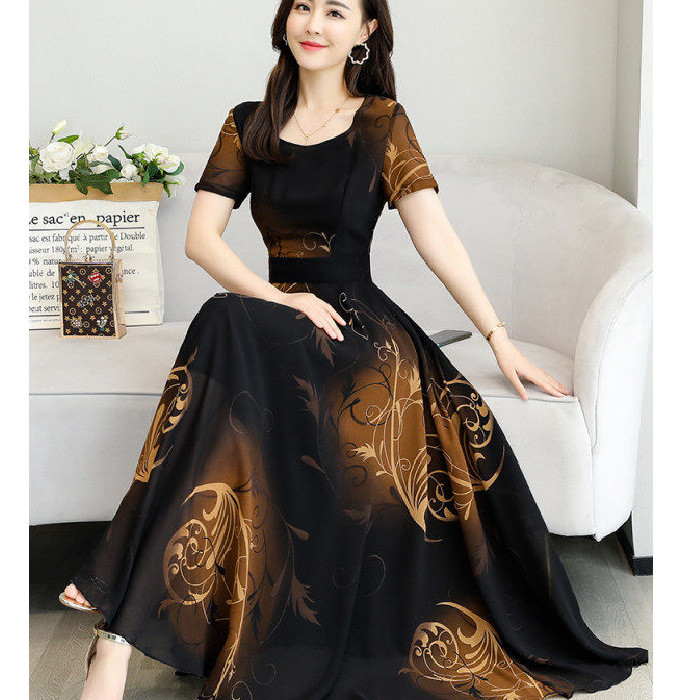 【Ready Stock】2025冰丝大码连衣裙女气质妈妈装修身收腰印花拼接轻熟风大摆裙子2025 Ice Silk Plus Size Dress Female Elegant Mom