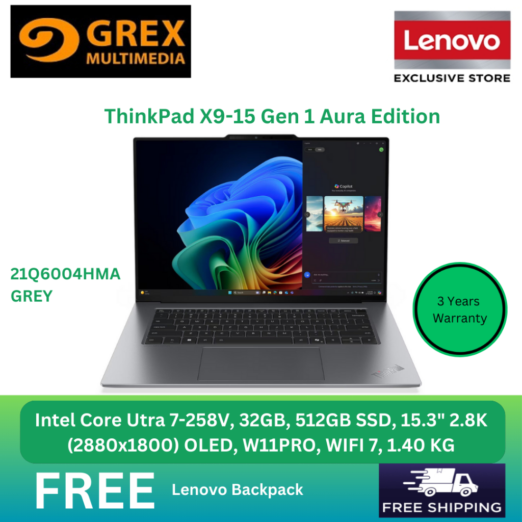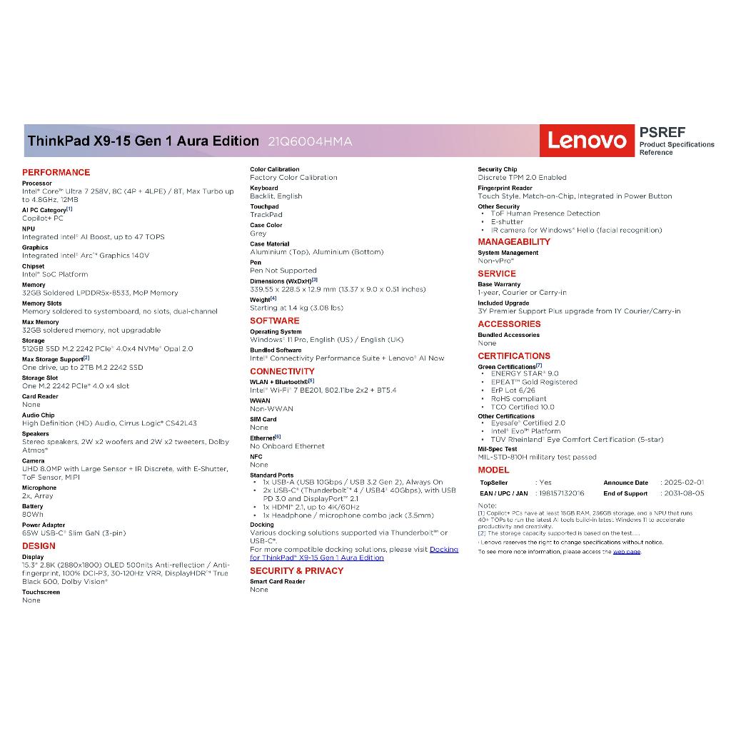 Lenovo ThinkPad X9-15 Gen 1 Aura Edition 21Q6004HMA Laptop (Ultra 7-258V, 32GB, 512GB , 15.3" 2.8K (2880x1800) OLED)