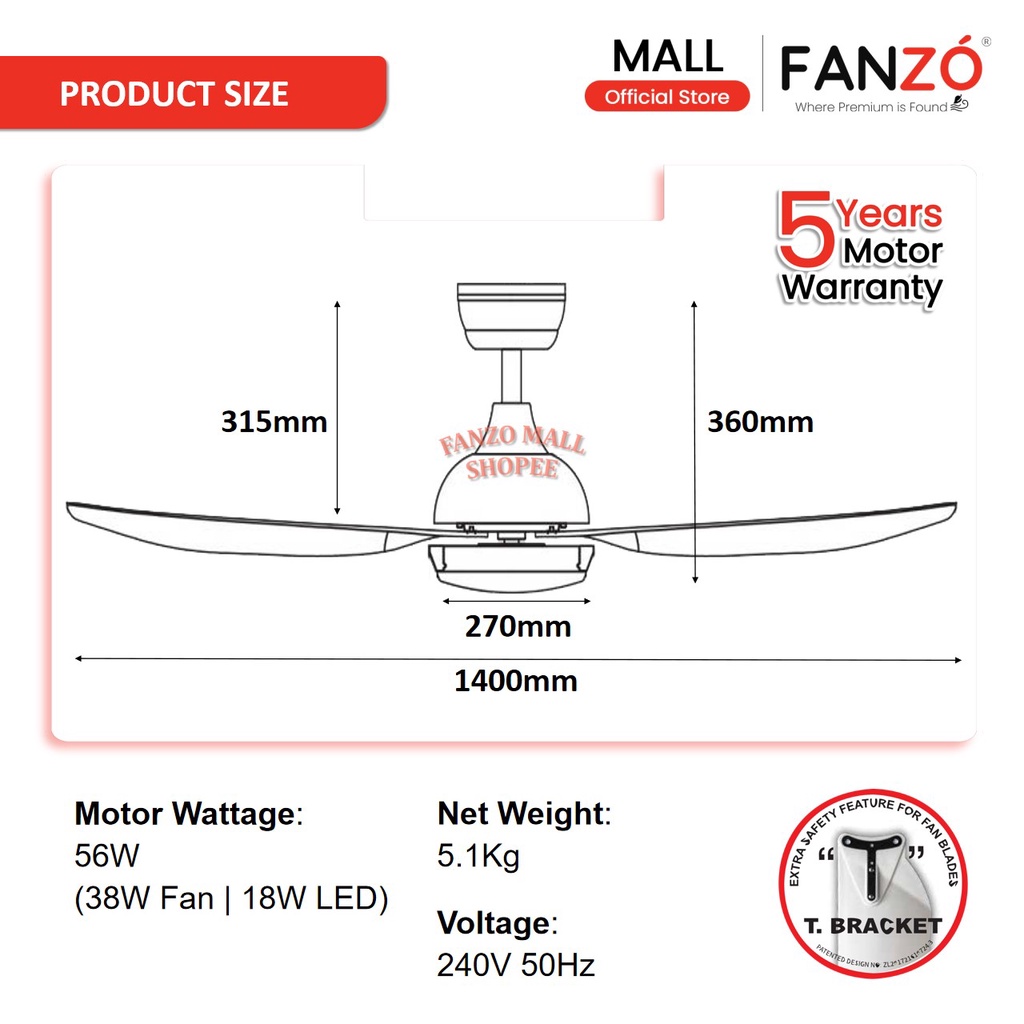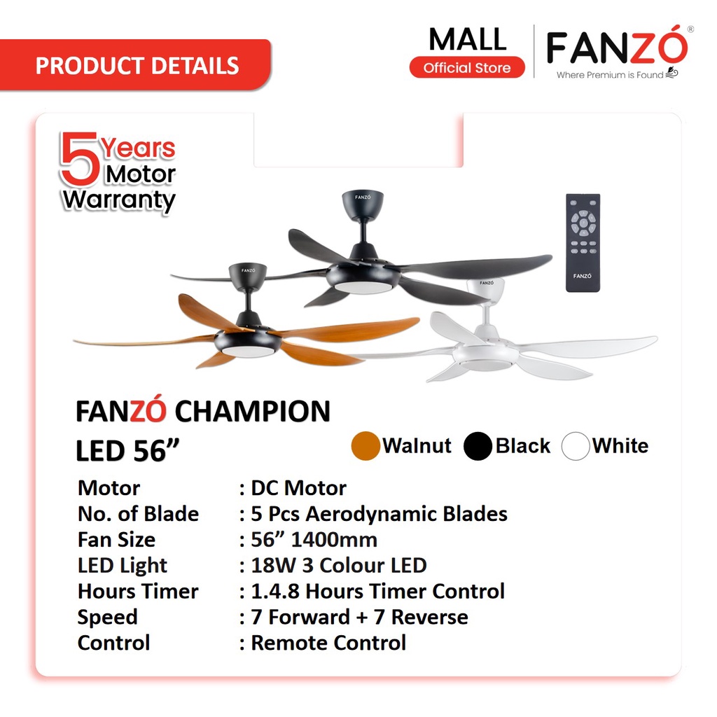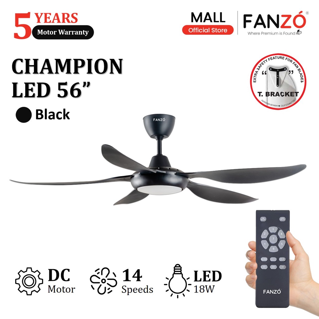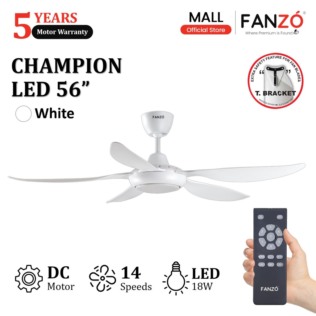 FANZO Champion LED 5 Blades DC Motor Ceiling Fan with Light 14 Speeds Remote Control (56")