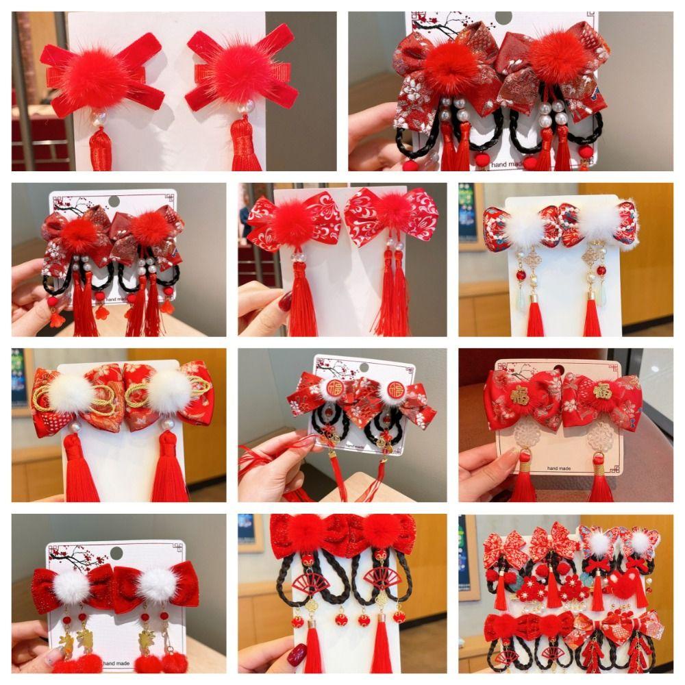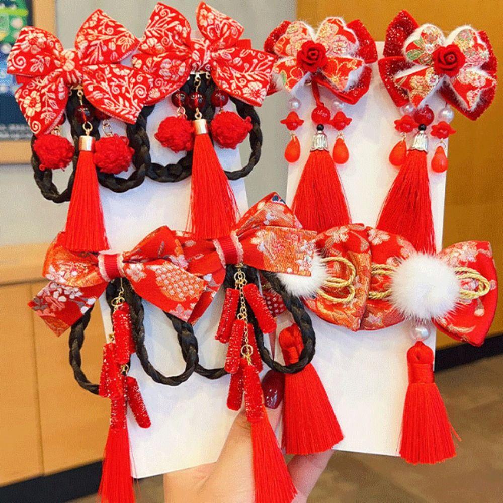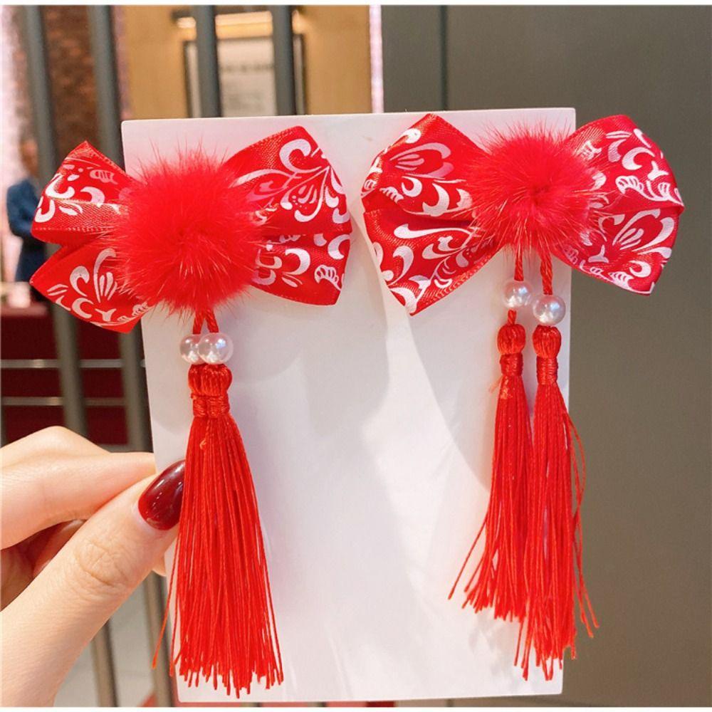 ALISONDZ Children New Year Hairpin, Hair Accessories Chinese Style New Year Barrettes, Elegant Hanfu Headdress Ancient Style Princess Red Bow Hair Clip Kids