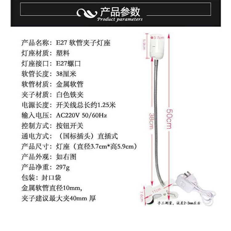 E27 Plug 360 Degrees Flexible Desk Lamp Holder E27 Base Light Socket Gooseneck Clip-On Cable With On Off Switch