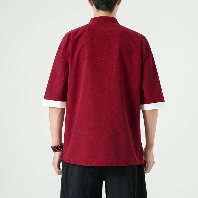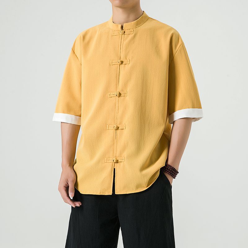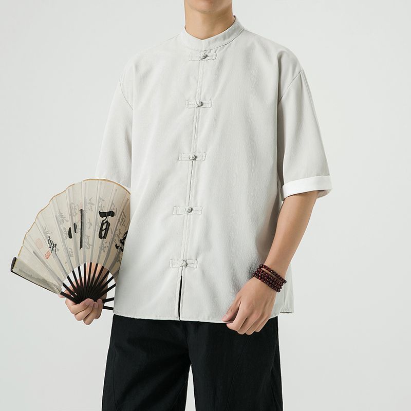 夏季中国风男装亚麻盘扣短袖衬衫男五分袖唐装古风棉麻汉服中山装Summer Chinese style men's linen button up short sleeved shirt men's half sleeved Tang suit ancie