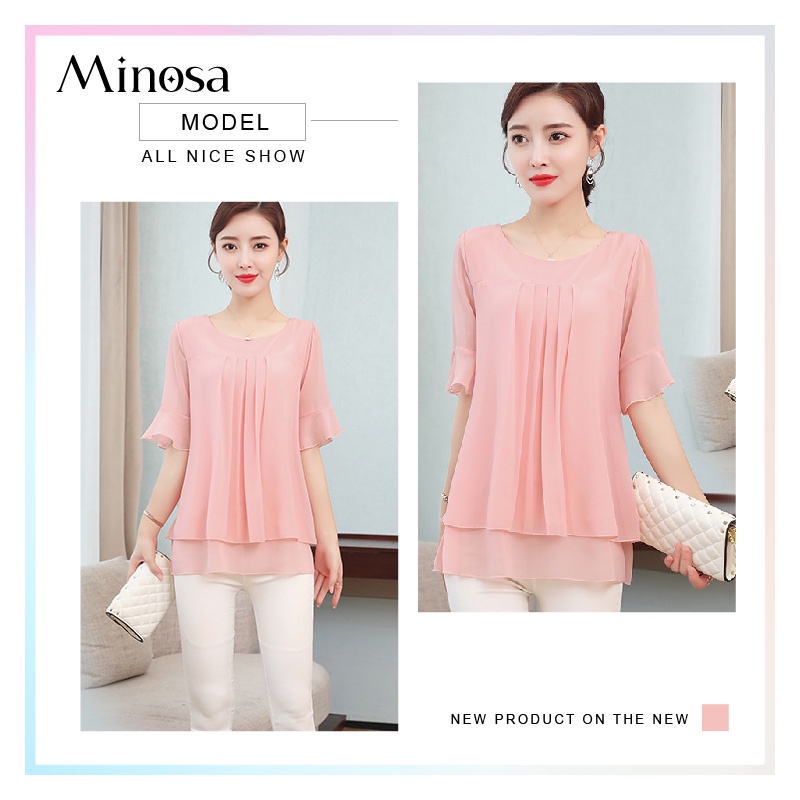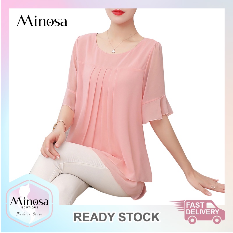 MINOSA Women Casual Plus Size Chiffon Blouse 3/4 Sleeve Round Neck Plain Loose L-3XL (Pink/Yellow/Red/Black)