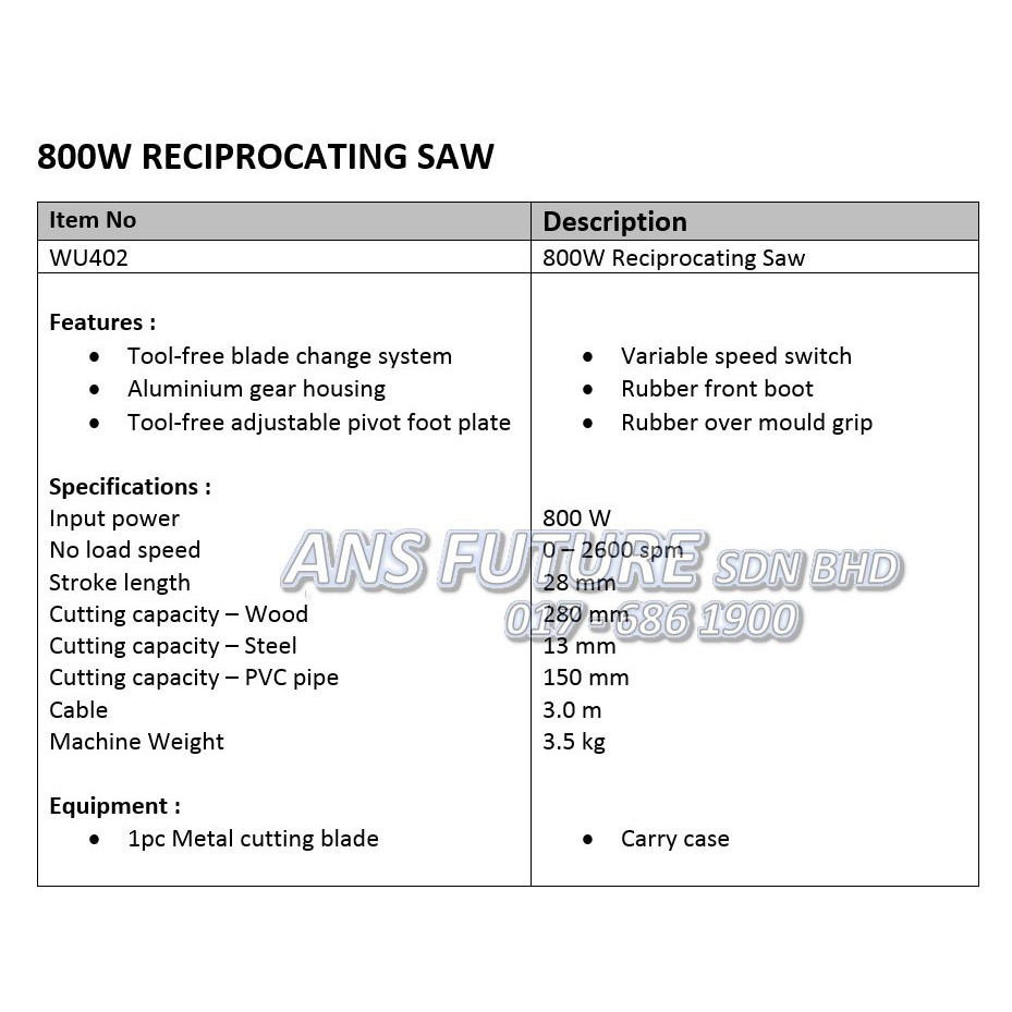 WORX WU402 Professional Series 800W Reciprocating Saw