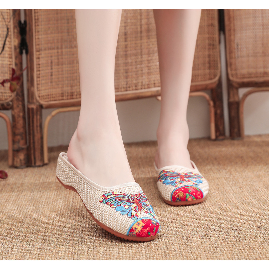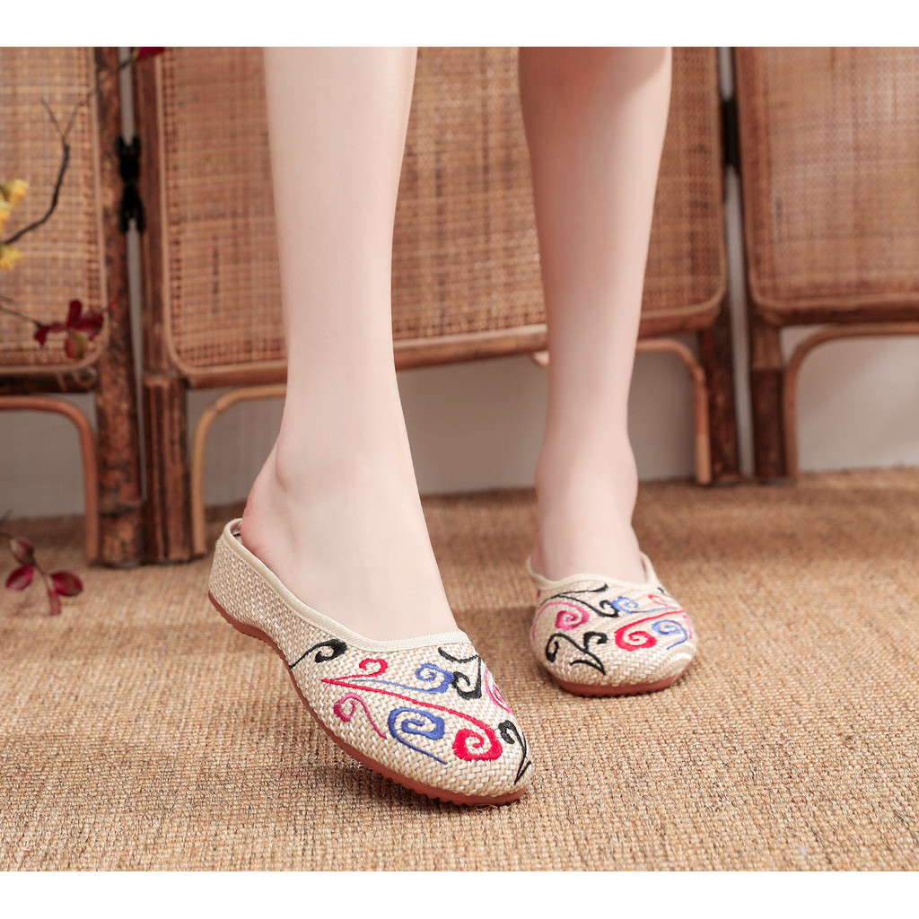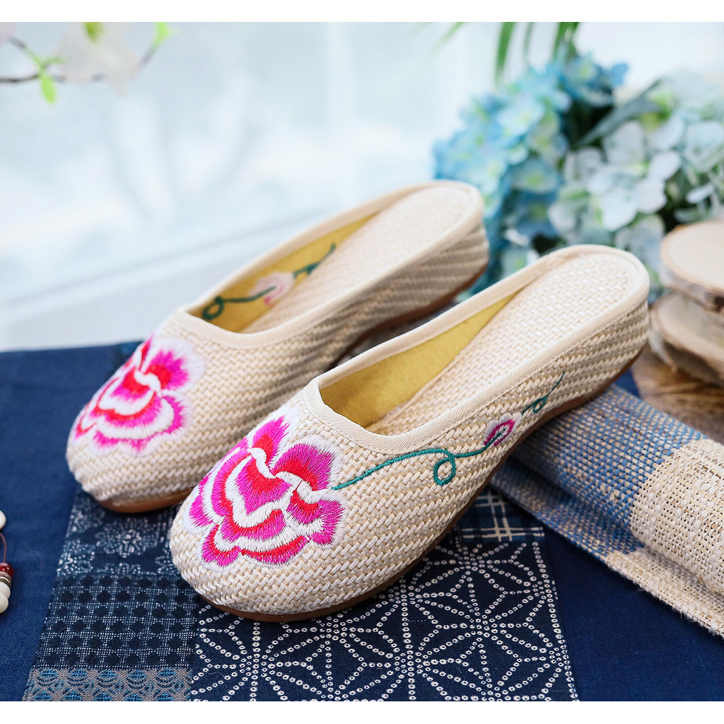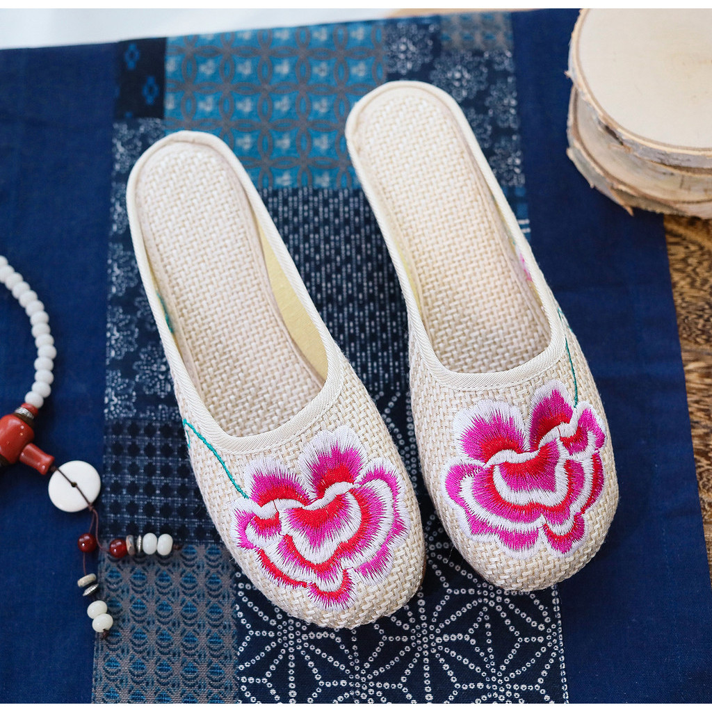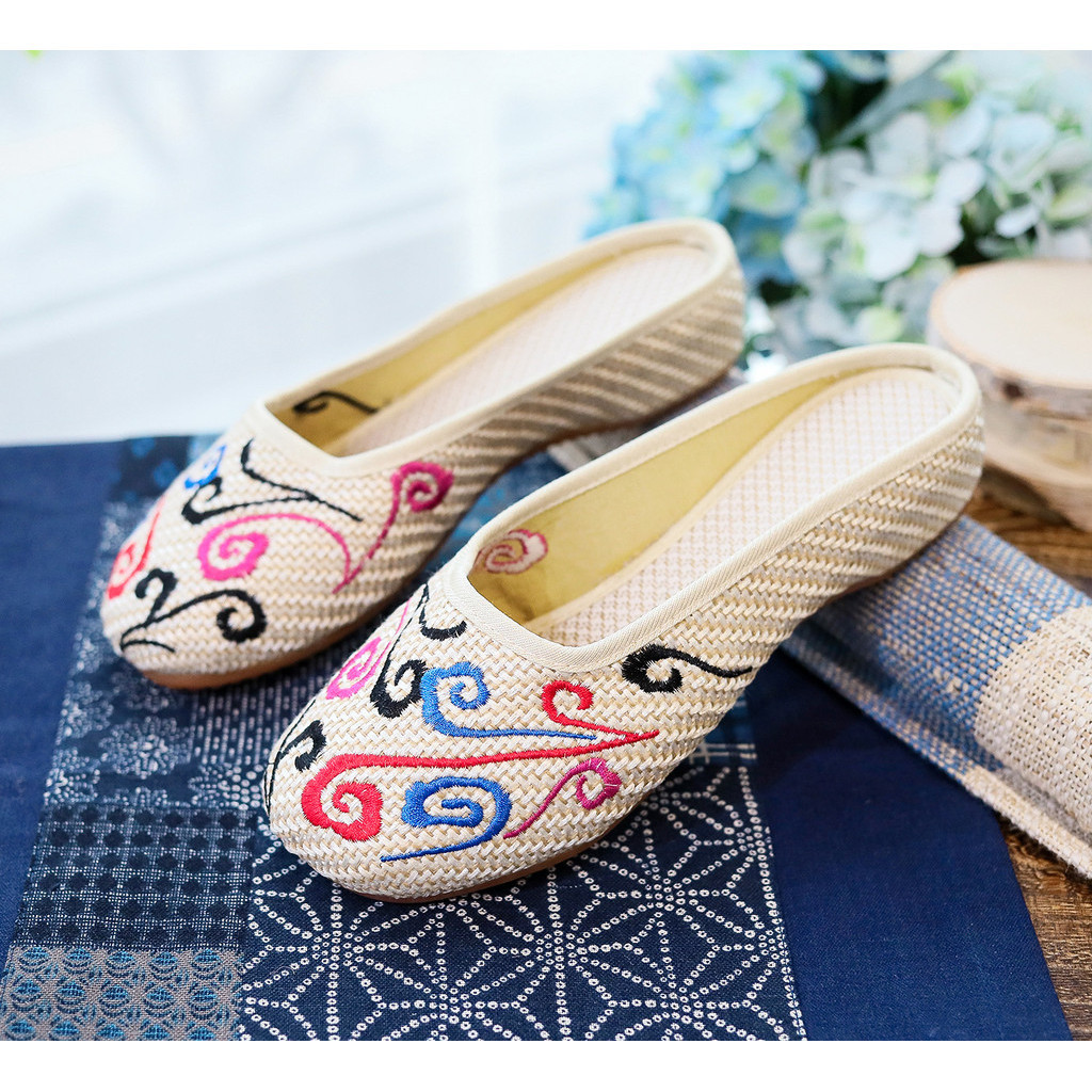 Women's Embroidered Cotton Shoes Toe Cap Slippers Casual Summer Walking Shopping Travel Cow's Tendon Bottom Slippers